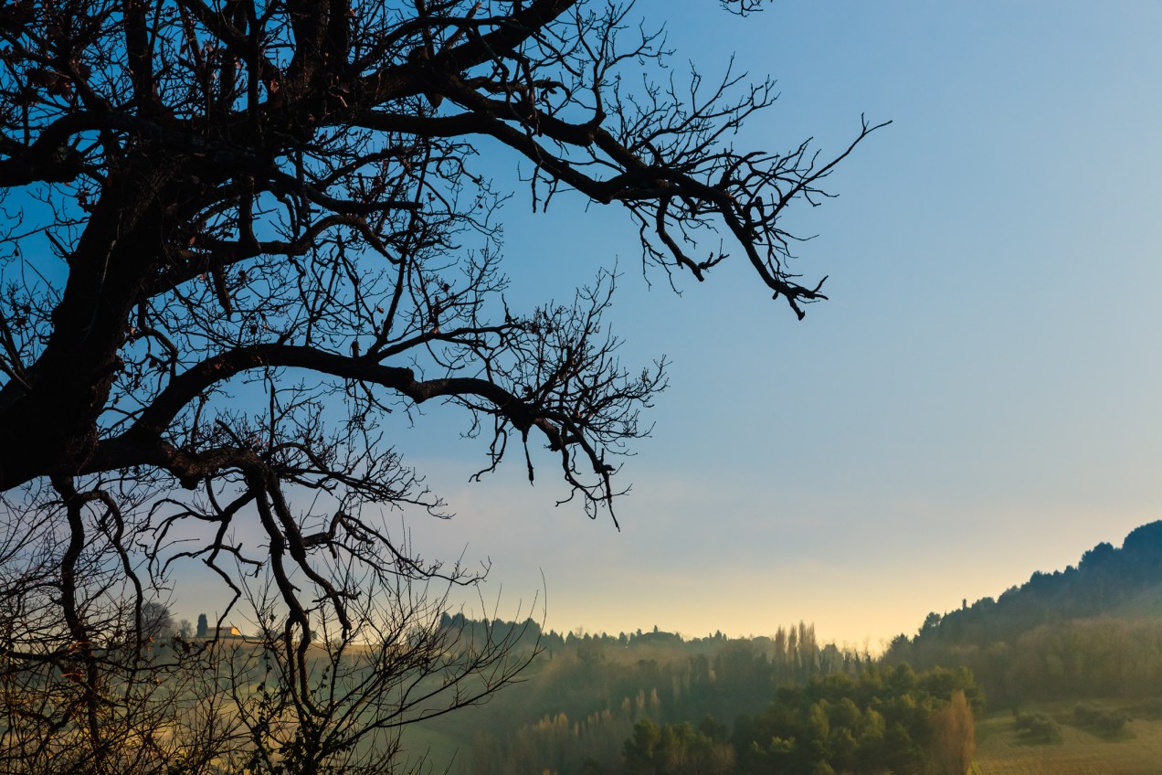 A large tree without leaves fills the foreground, framing a landscape of distant hillsides filled with trees and orchards. On the road between Rimini and Ancona, Italy.