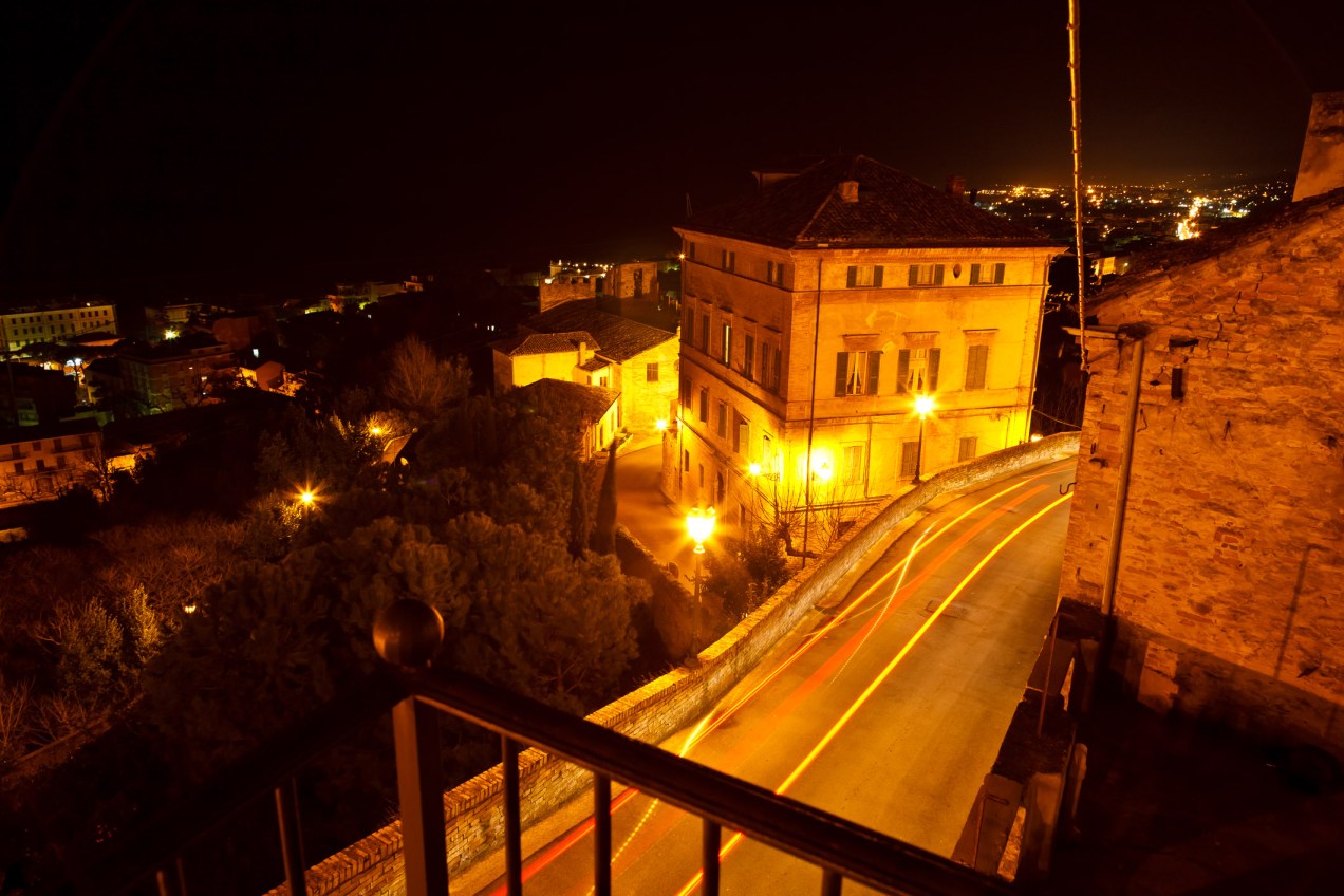 Nighttime above a street in Grottammare, Italy. Headlights and taillights leave streak marks in this long exposure.