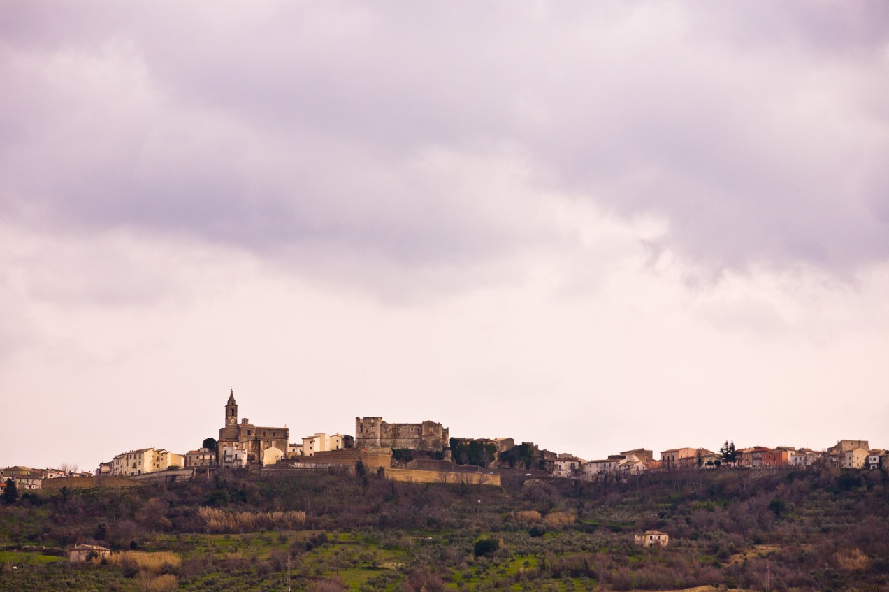 An ancient castle and town, nestled on a tall hillside in the mountainous Abruzzo region of Italy.