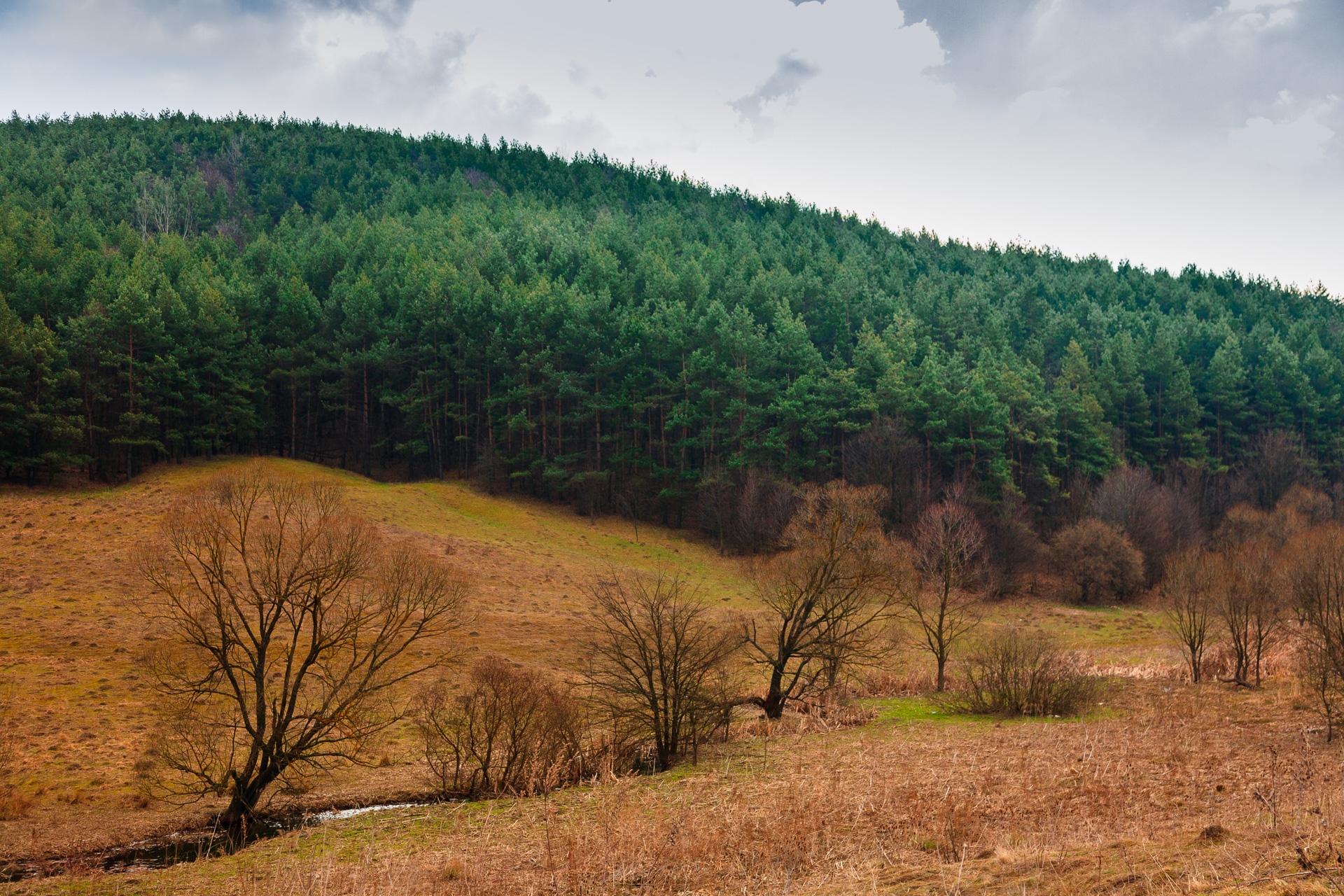 A thick forest of conifers cover the hill in the background while a quiet little stream winds its way through thickets and sparse trees in the valley below.