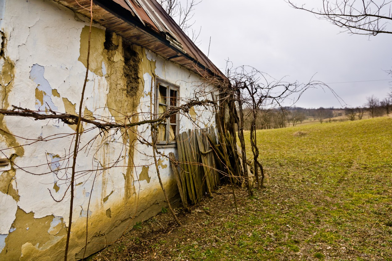 A crumbling old country house sits unused at the bottom of a hill in a little village in Moldova, Romania.