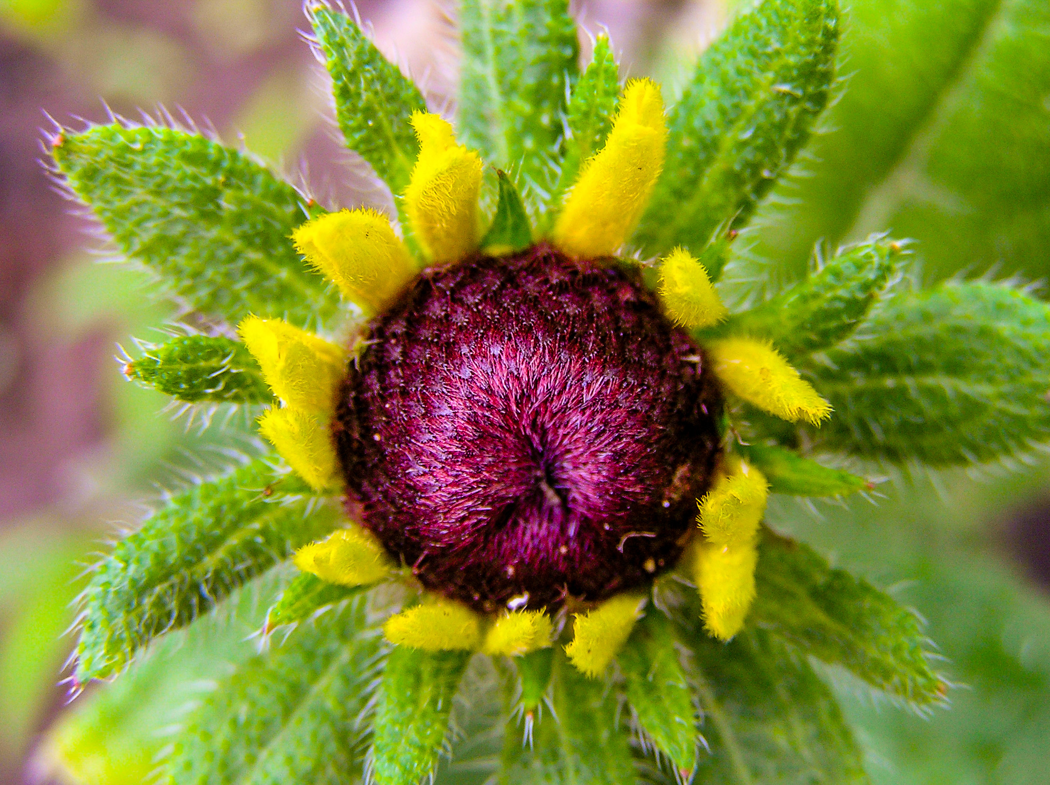 The unusual blossom of a small, soft, hairy flower with a deep-brown interior