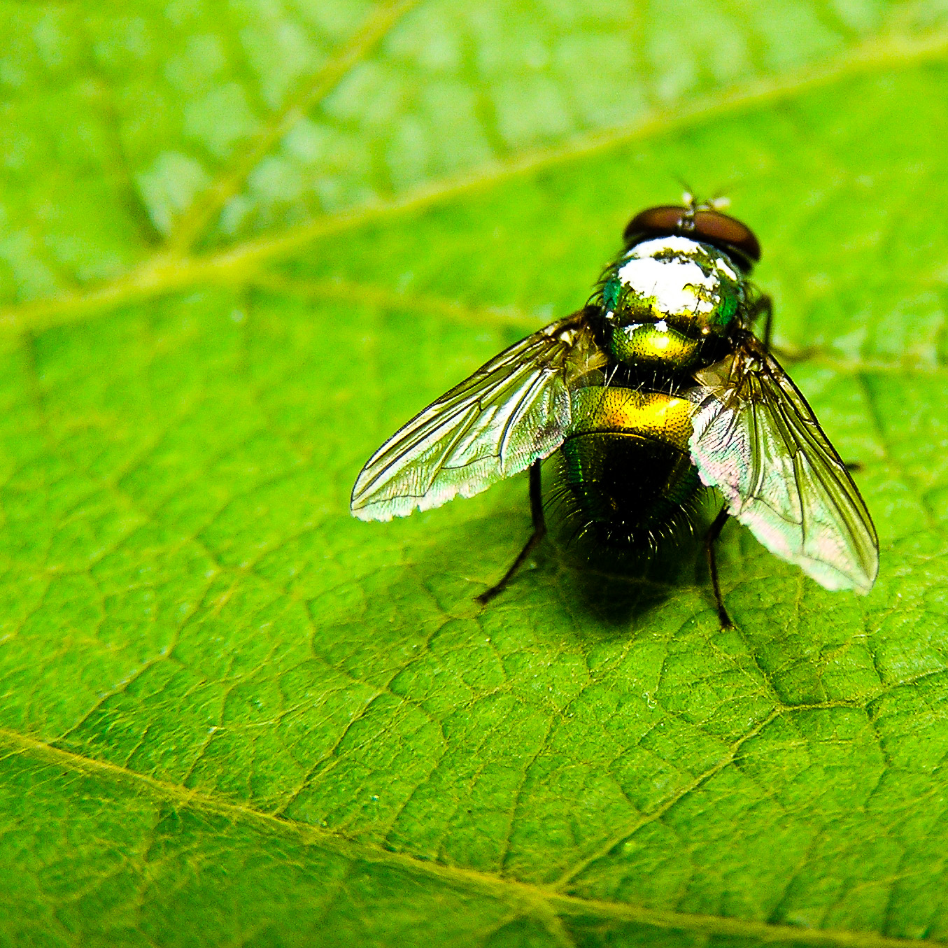 An iridescent fly suns itself on a grape leaf. Medias, Romania.