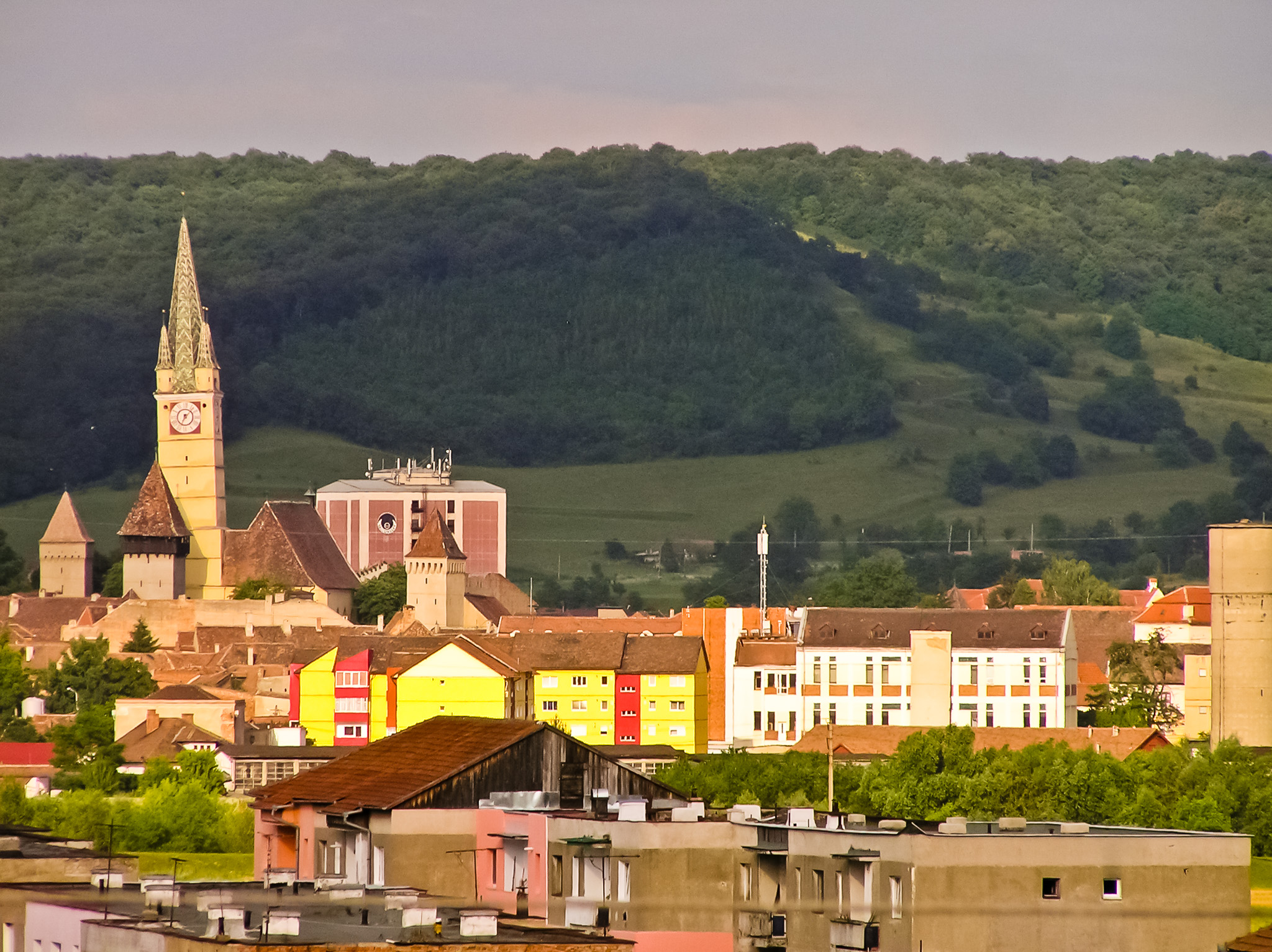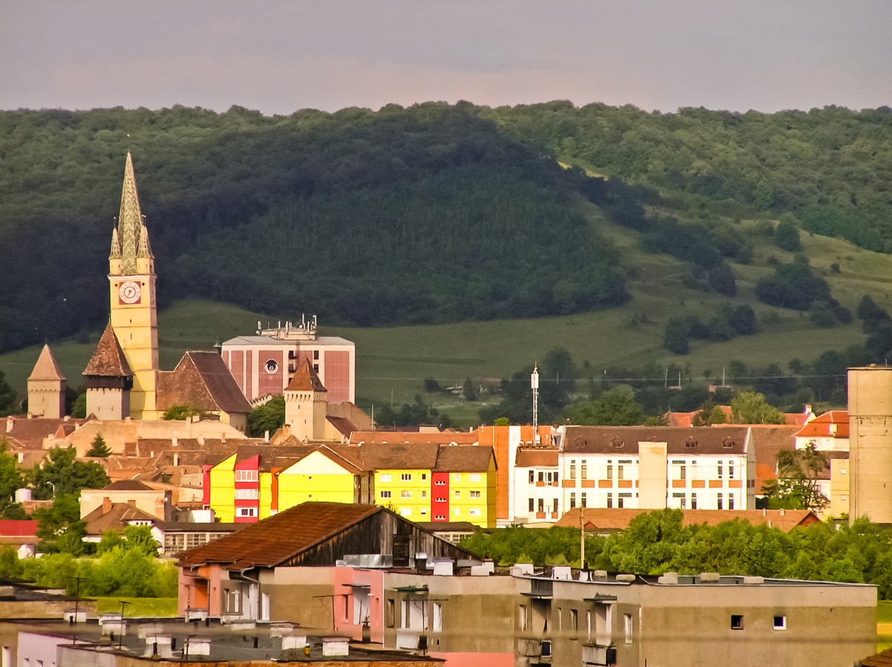 The towers of the medieval city of Medias, Romania are visible in the distance on a bright summer day. Houses and villas from downtown can also be seen.