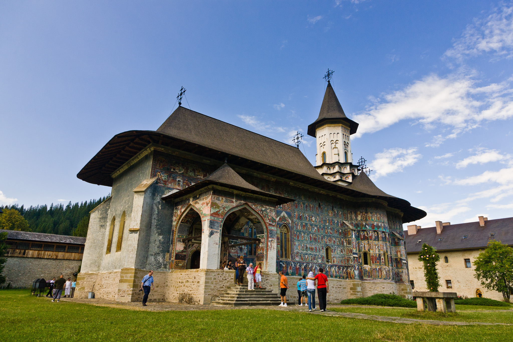 Church and interior courtyard, Manastirea Sucevita, Bucovina, Romania.