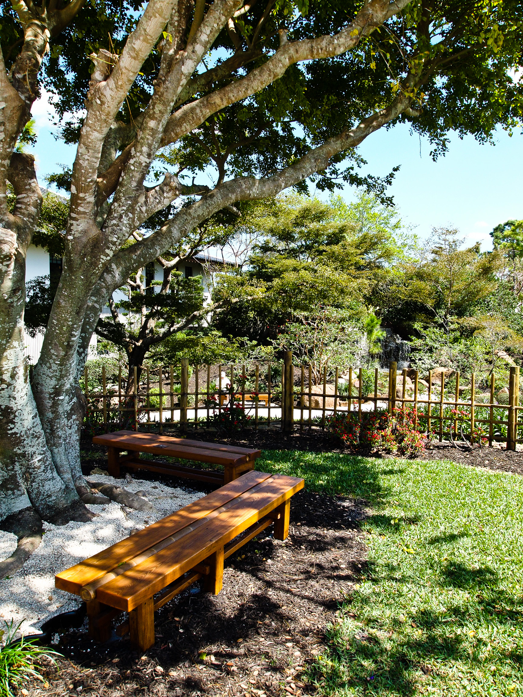 Wooden benches below a large tree, Morikami Museum and Japanese Gardens, Delray Beach, FL, USA.
