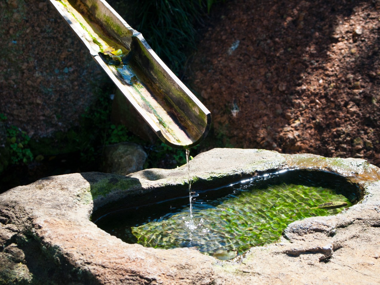Water drips from a bamboo spout, Morikami Museum and Japanese Gardens, Delray Beach, FL, USA.