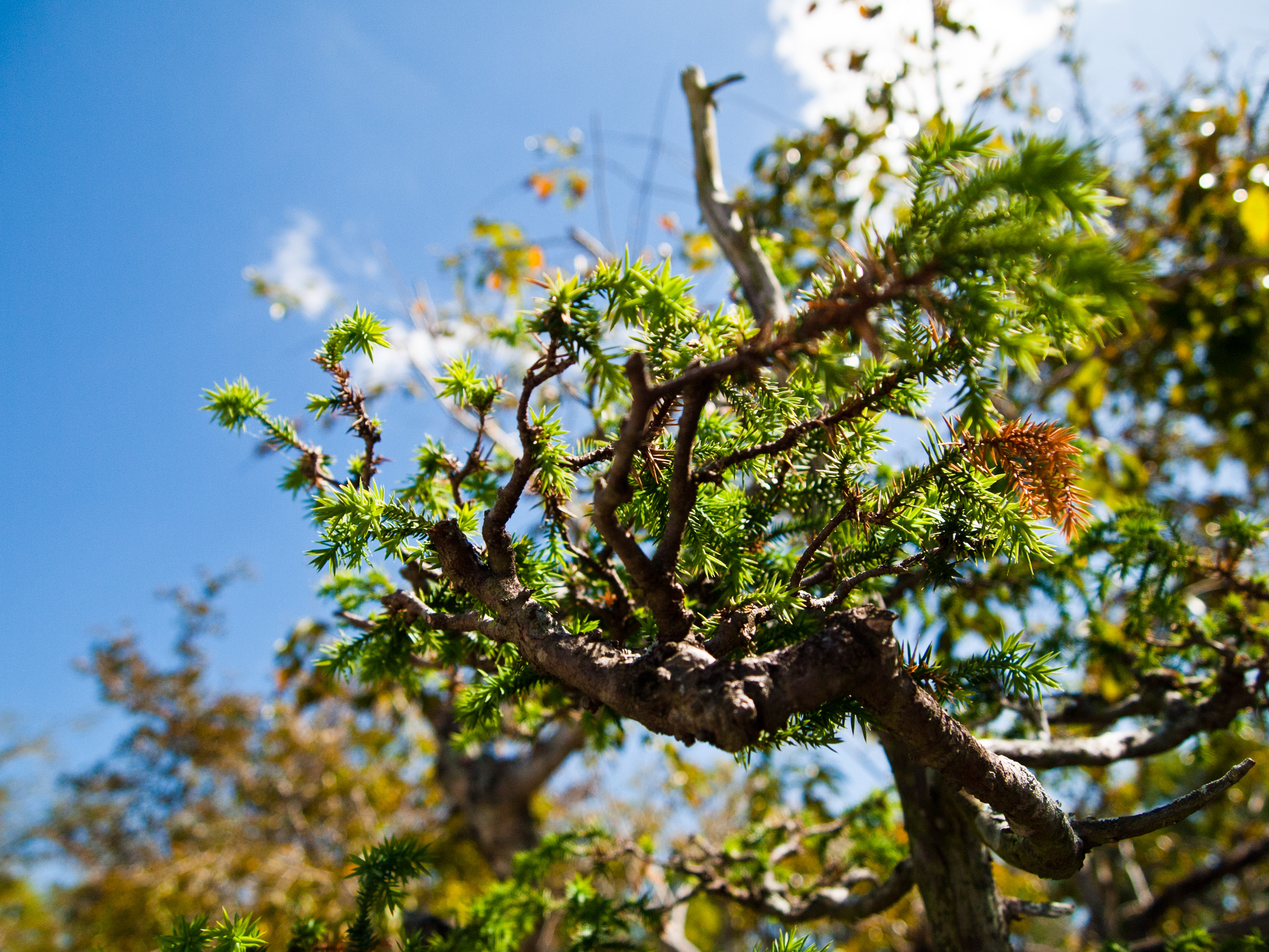 Underneath a bonsai tree branch, Morikami Museum and Japanese Gardens, Delray Beach, FL, USA.