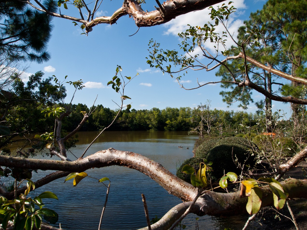 Branches frame the view, Morikami Museum and Japanese Gardens, Delray Beach, FL, USA.
