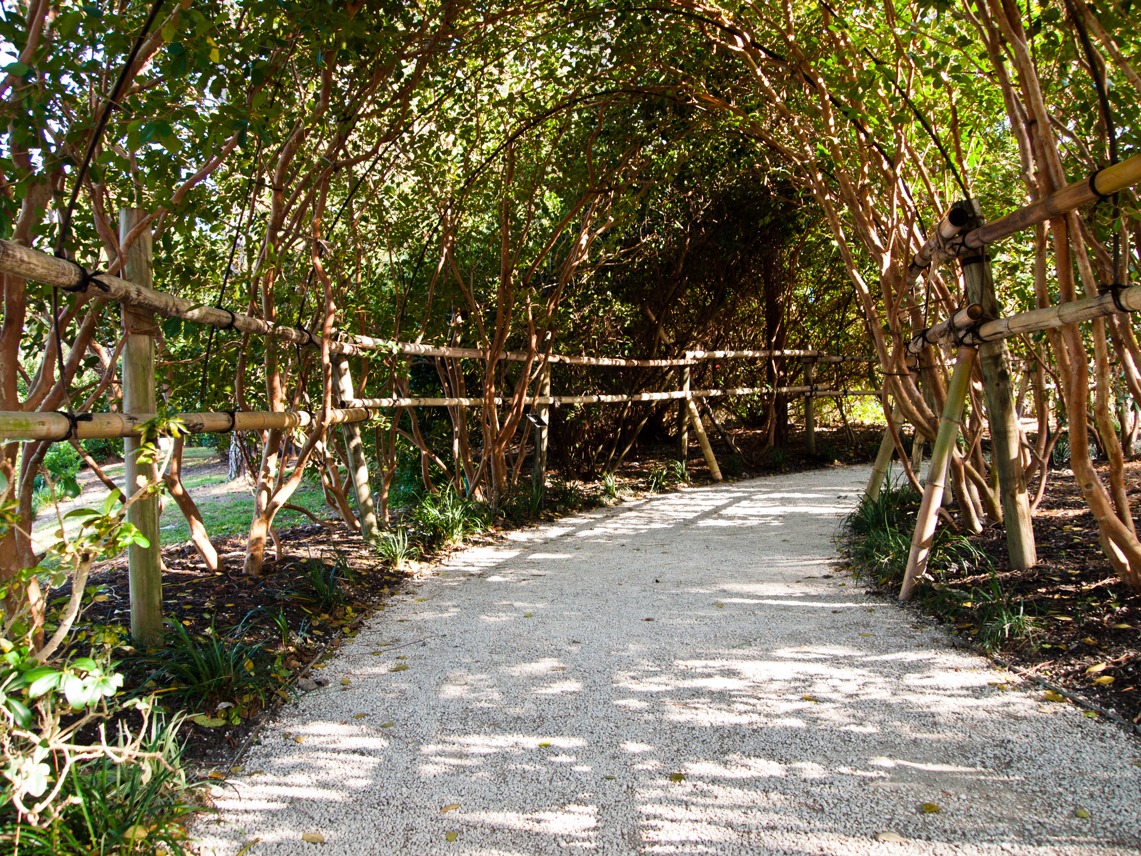Wonderful path below an arch of tree branches, Morikami Museum and Japanese Gardens, Delray Beach, FL, USA.