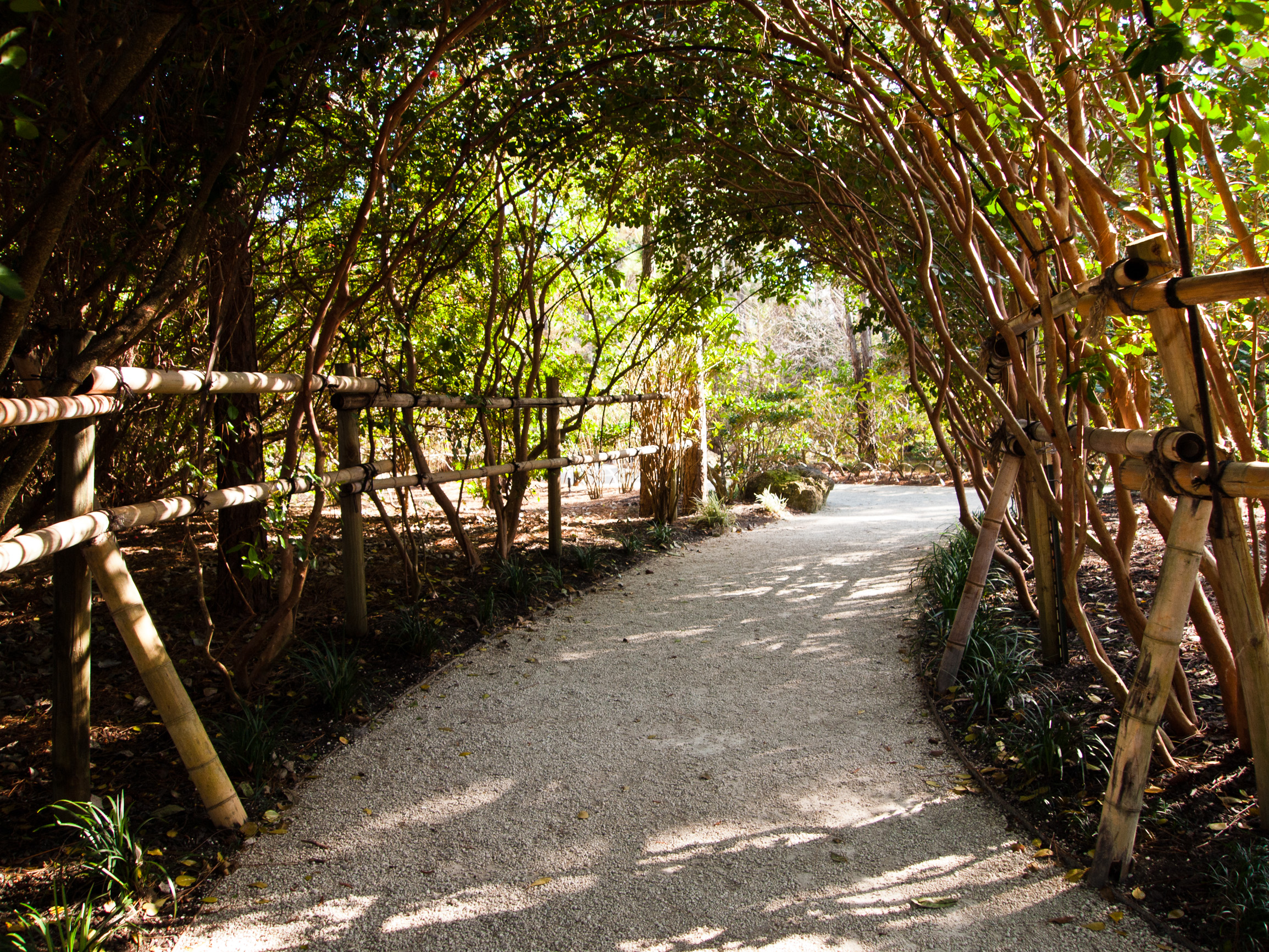 Wonderful path below an arch of tree branches, Morikami Museum and Japanese Gardens, Delray Beach, FL, USA.