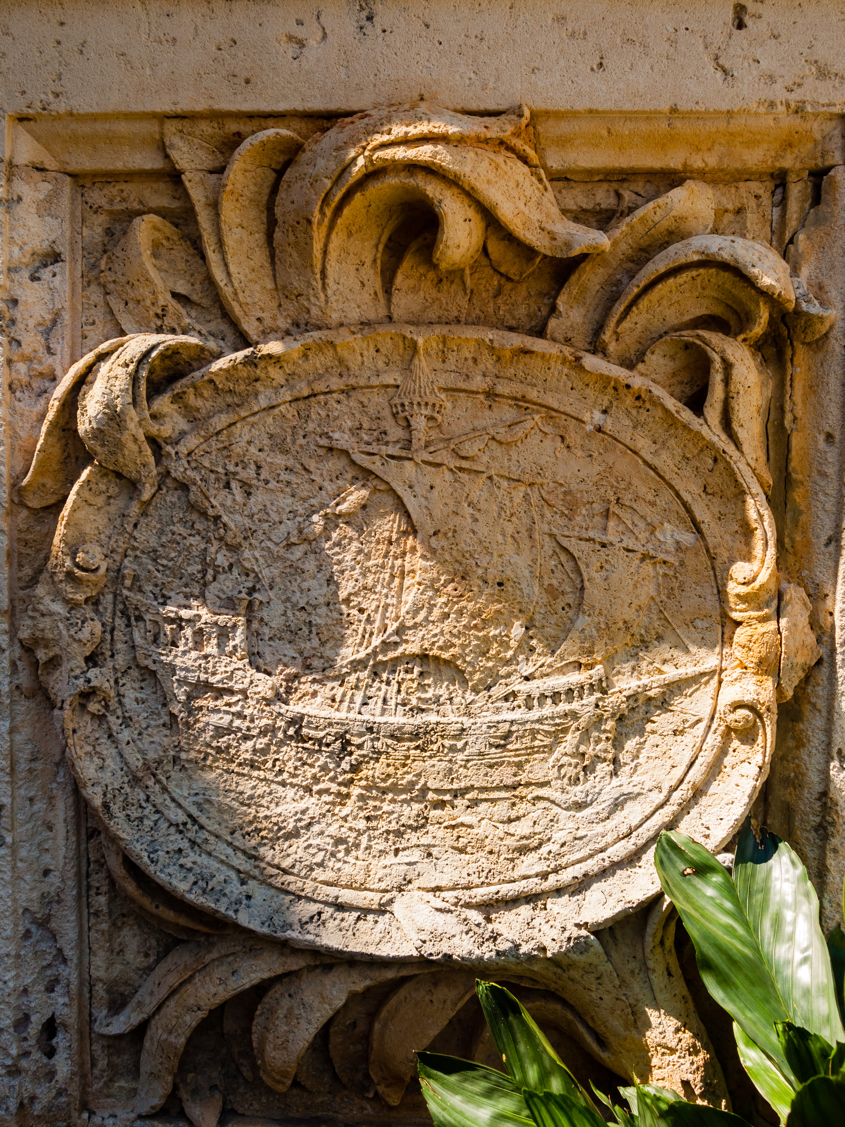 A ship carved into a stone emblem. Vizcaya, Miami, Florida, USA