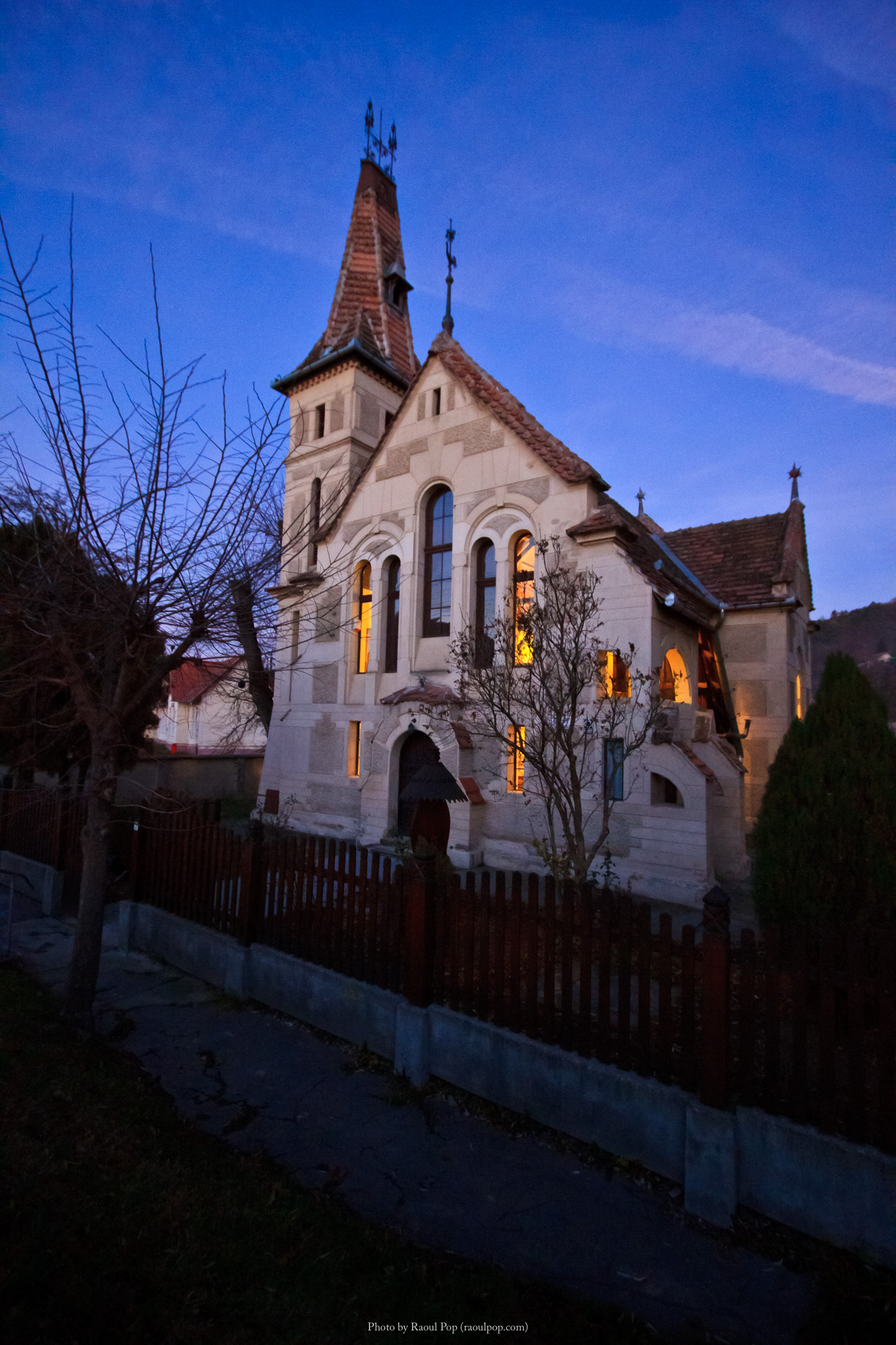 A lovely little reformed church in Sighisoara, Romania, at twilight.