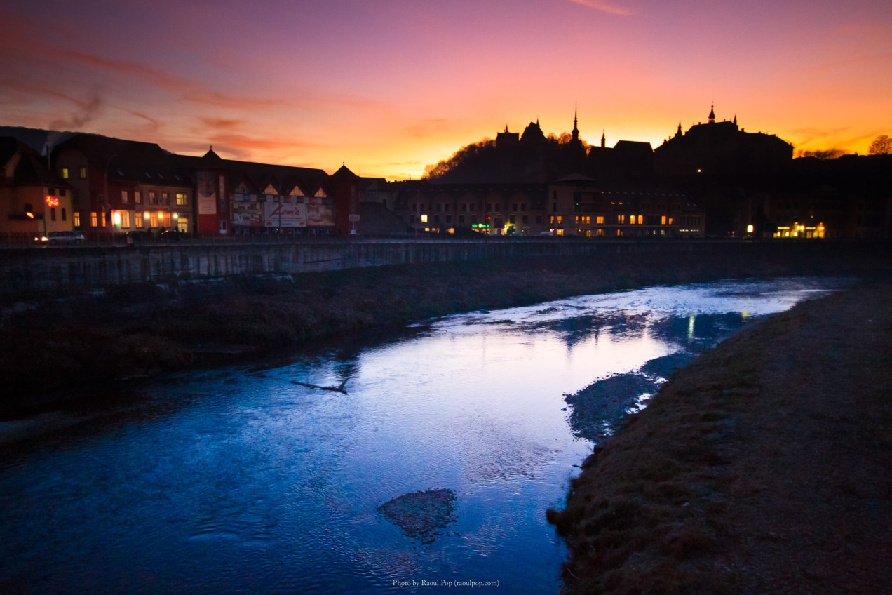 On a bridge in downtown Sighisoara, Romania, after sunset, as the dark begins to set in. The river is Tarnava Mare.
