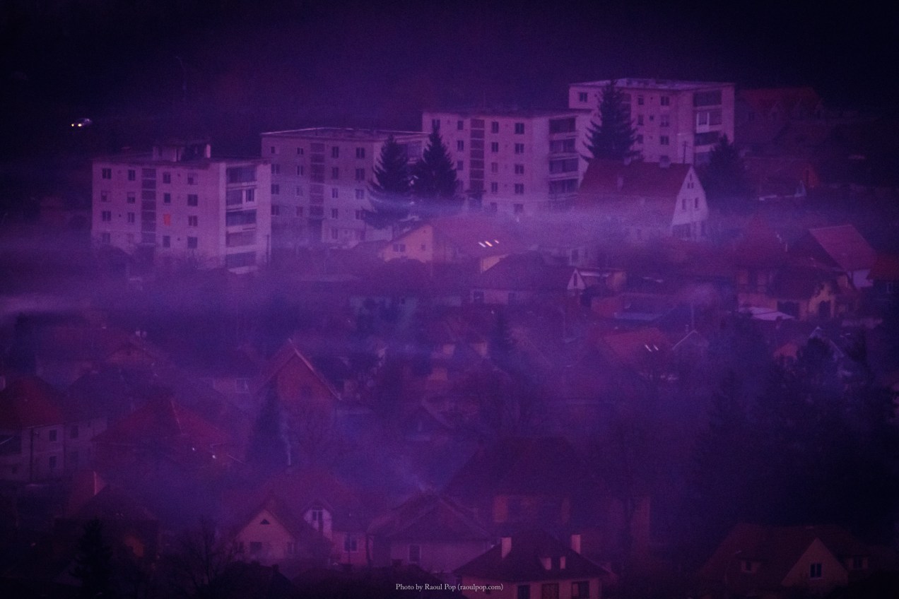 Fog sets in at twilight over the city of Sighisoara, Romania.