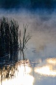 A quiet lake shore, reeds and fog, autumn morning.
