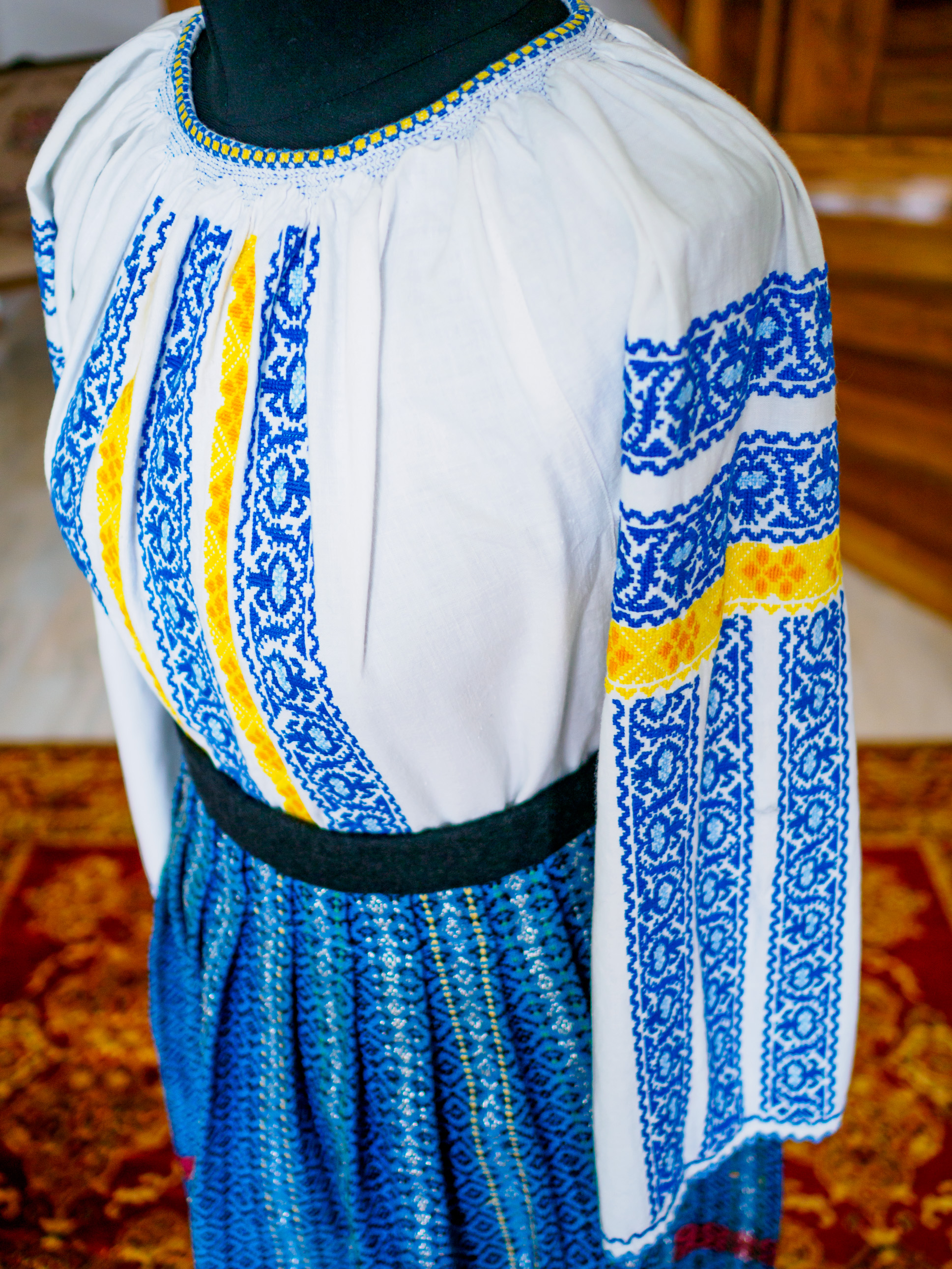 Details from a hand-sewn, traditional Romanian costume featuring ancient motifs