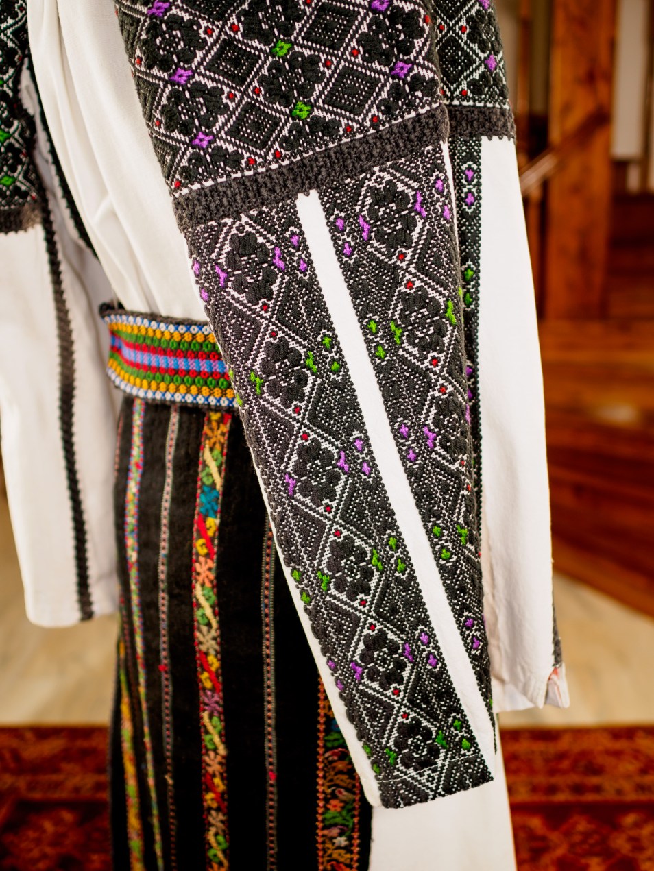 Details from a hand-sewn, traditional Romanian costume featuring ancient motifs