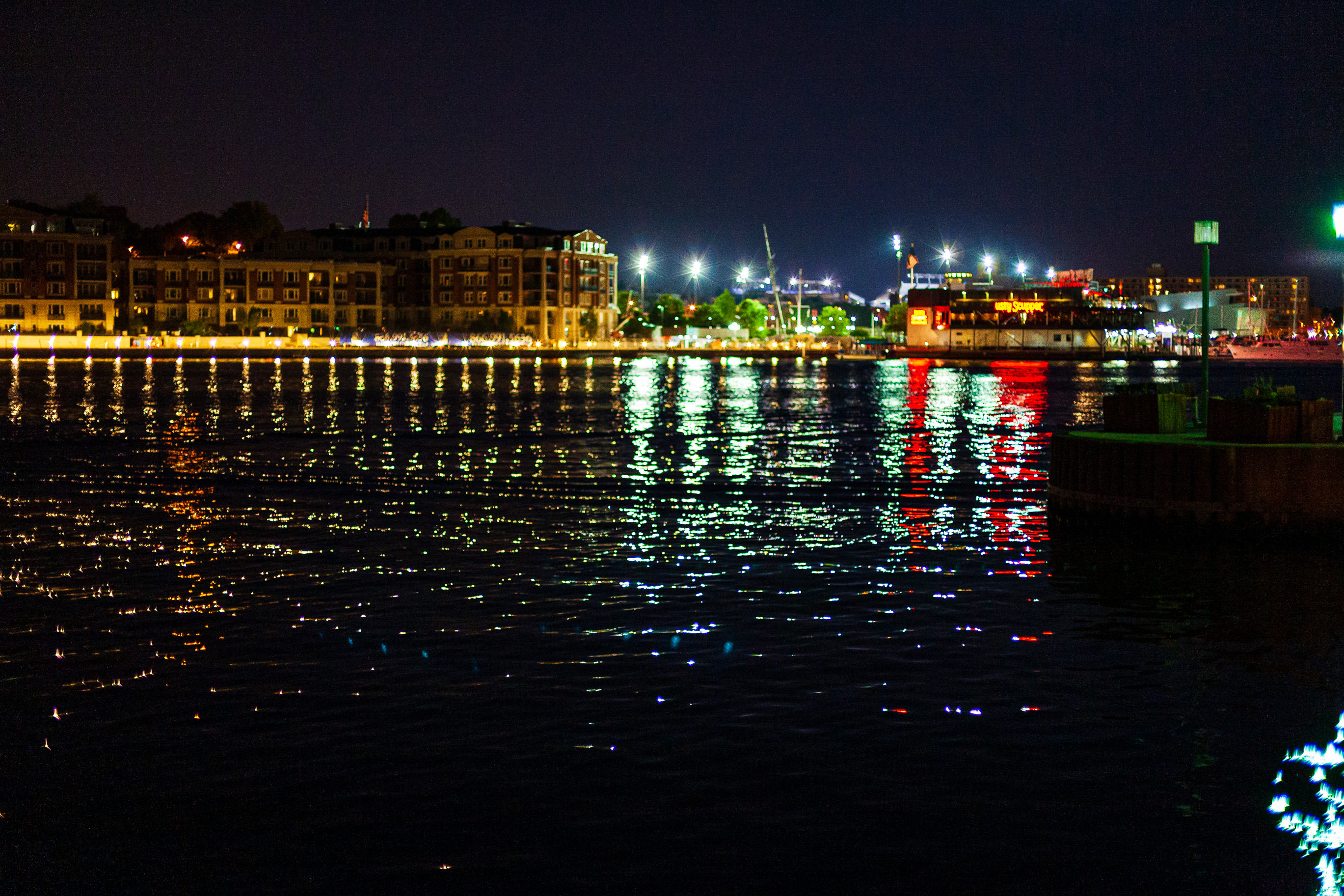 Apartment buildings on the harbor, at night, Baltimore, MD, USA.
