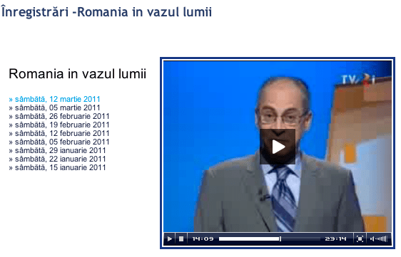 My show, Romania Through Their Eyes, was featured a second time on TVR International this past weekend, on a news program hosted by Horia Grusca, called “Romania in Vazul Lumii” (March 19th, 2011 edition). You can watch the archived show online. The segment where my show is presented starts at minute 13:14 and ends at minute 22:23.