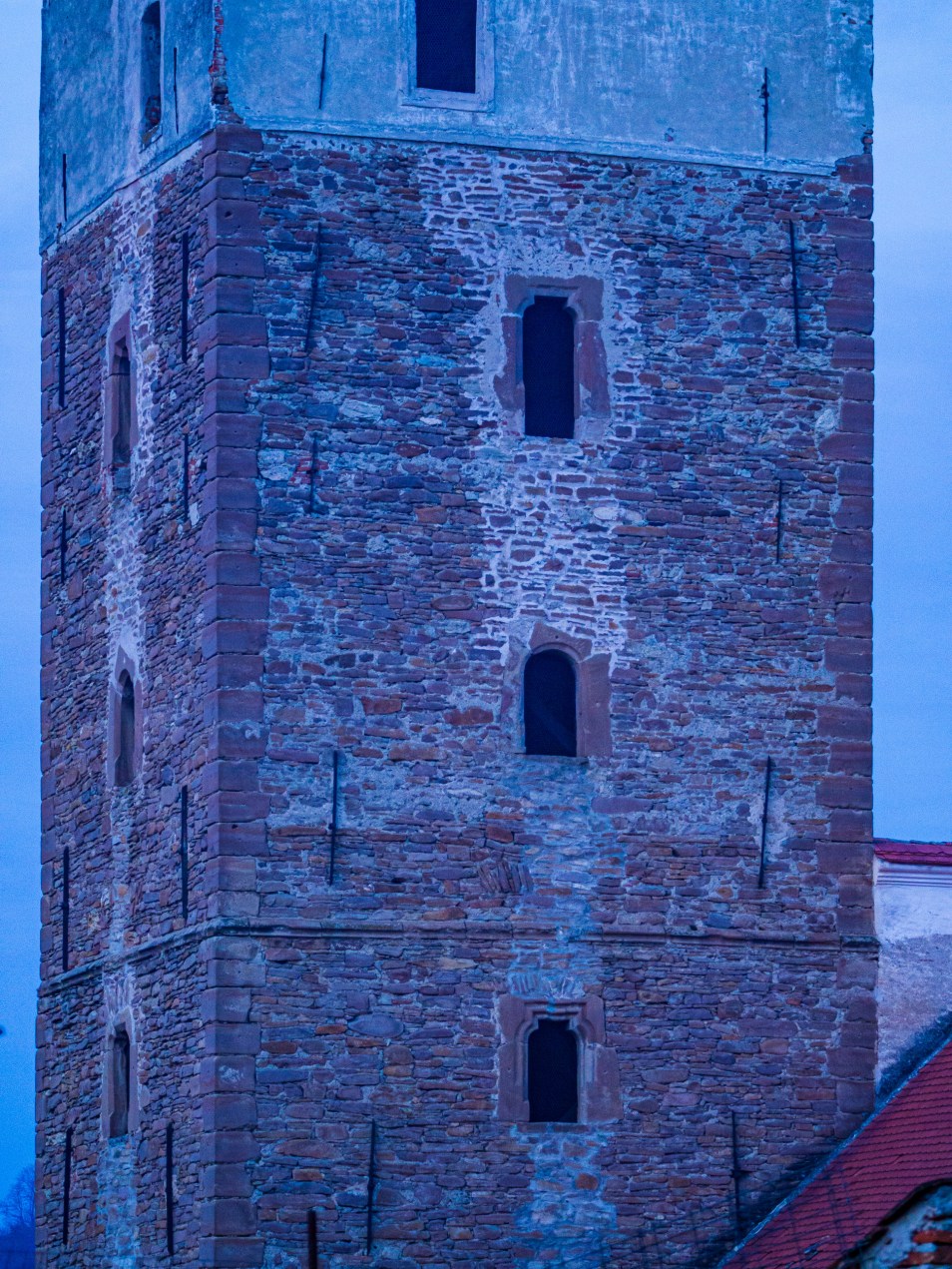 The clock tower of the Kirchenburg in Mosna (Meschen) on a late autumn evening