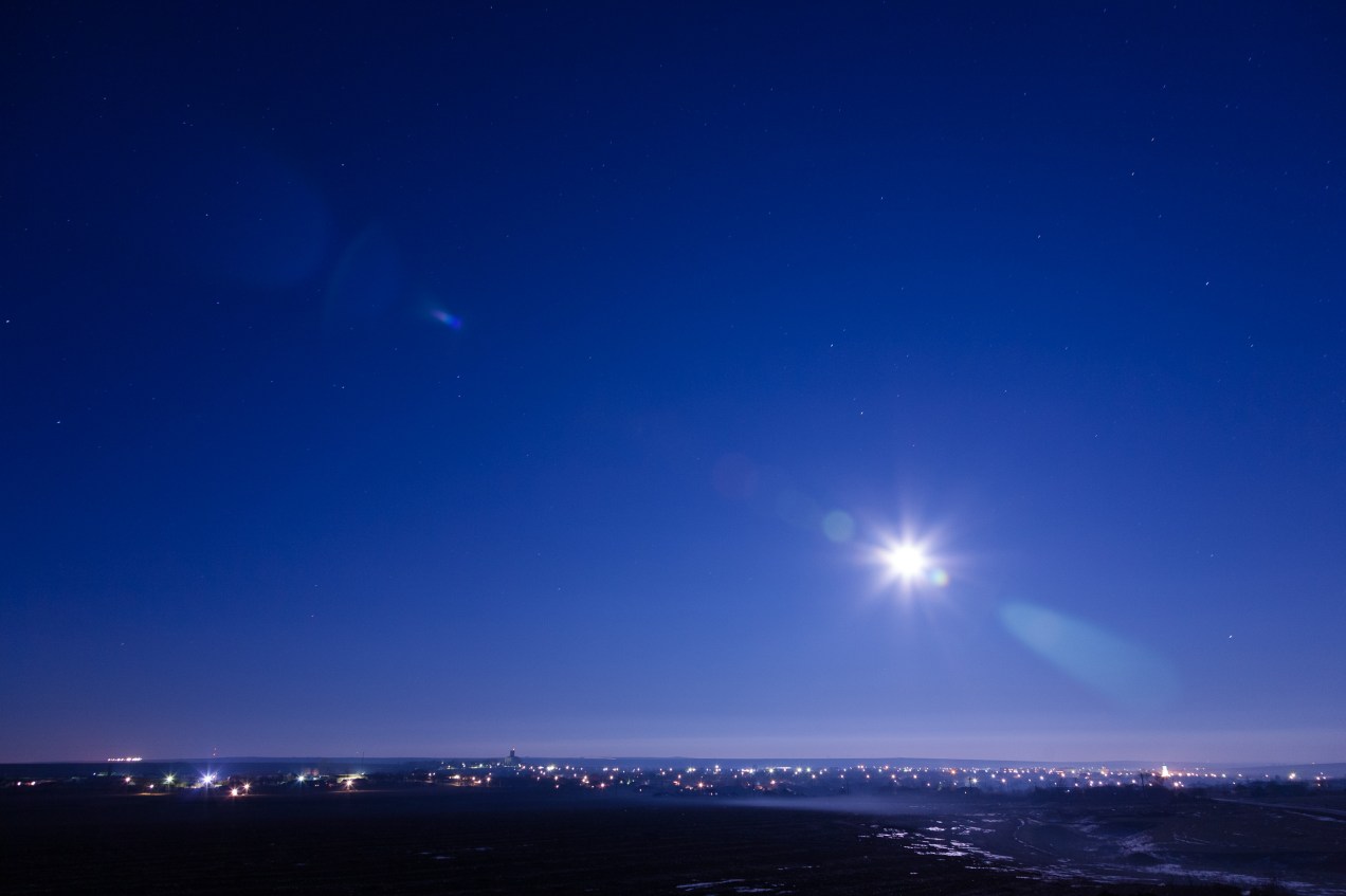 In the fields outside the village of Cogealac, in Dobrogea, Romania. It’s a full moon on this night, and it has caused an interesting lens flare effect in this long exposure. The village lights are visible in the distance.