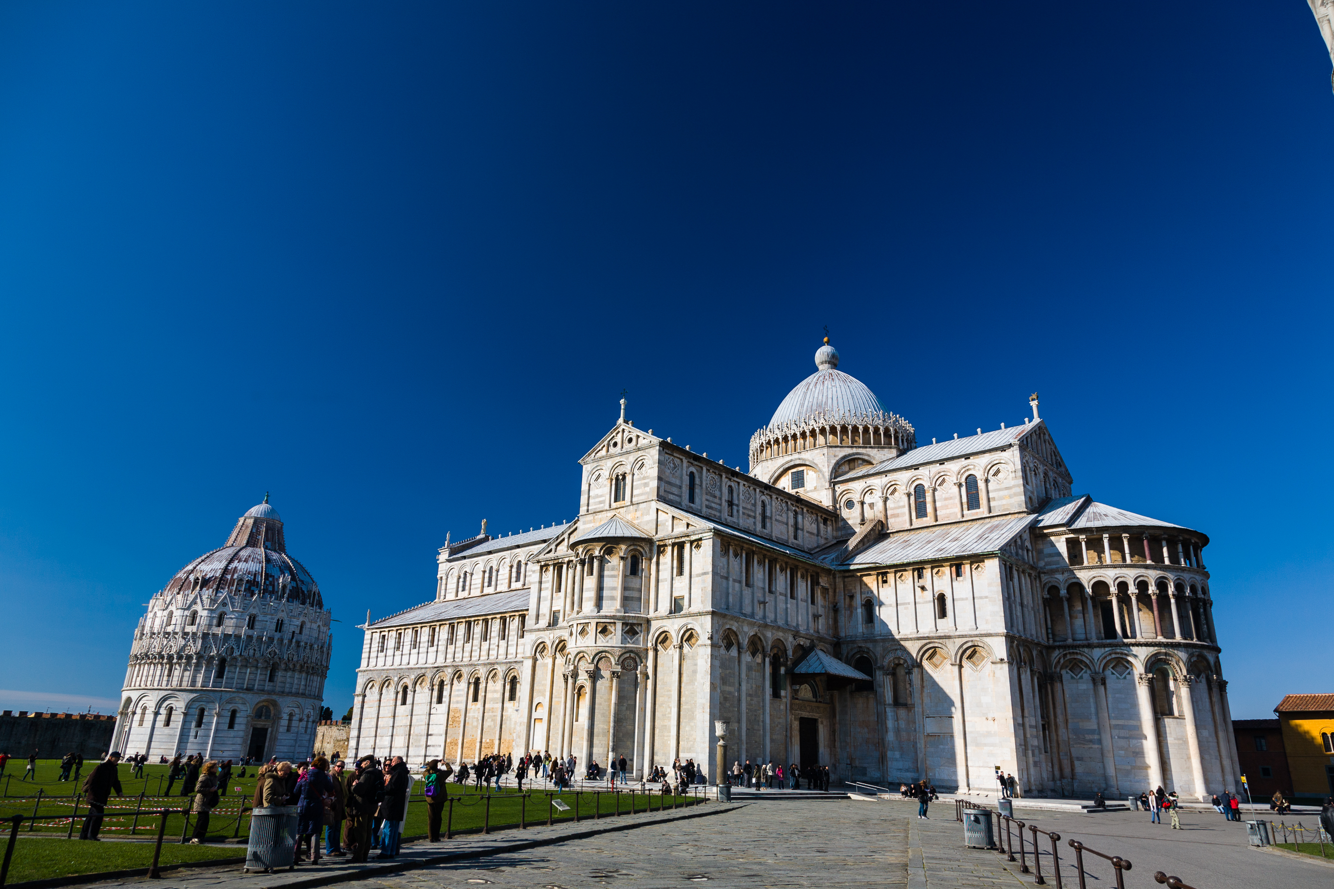 The main cathedral, plus the smaller, circular structure topped bu a cupola. The leaning tower is leaning into the photo, top right corner. Pisa, Italy.