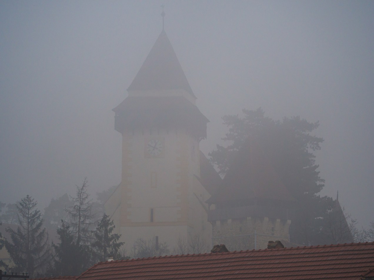 The clock tower of the Kirchenburg in Apold (Pult) enveloped in fog on a winter morning