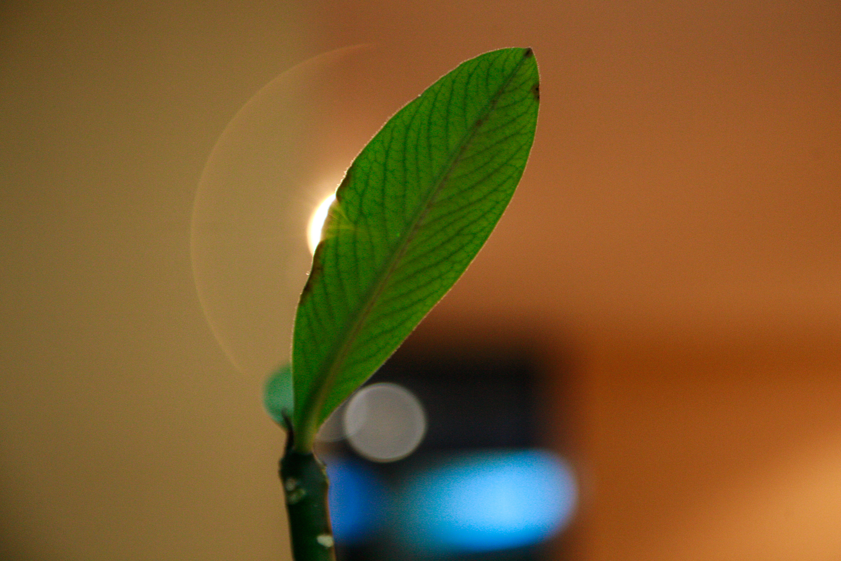 A leaf, backlit by a spot light. A semicircle halo effect is created. Lights shine softly in the background. Constanta, Romania.