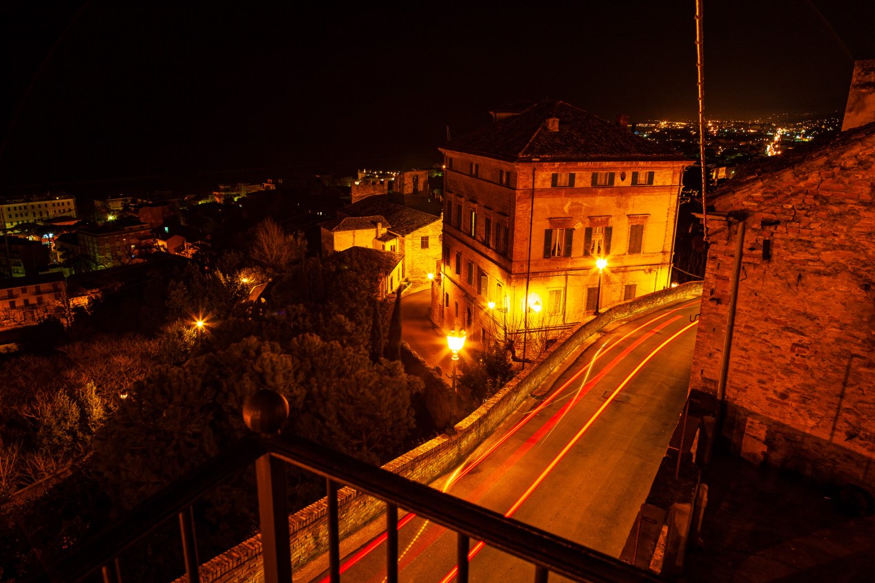 Nighttime above a street in Grottammare, Italy. Headlights and taillights leave streak marks in this long exposure.