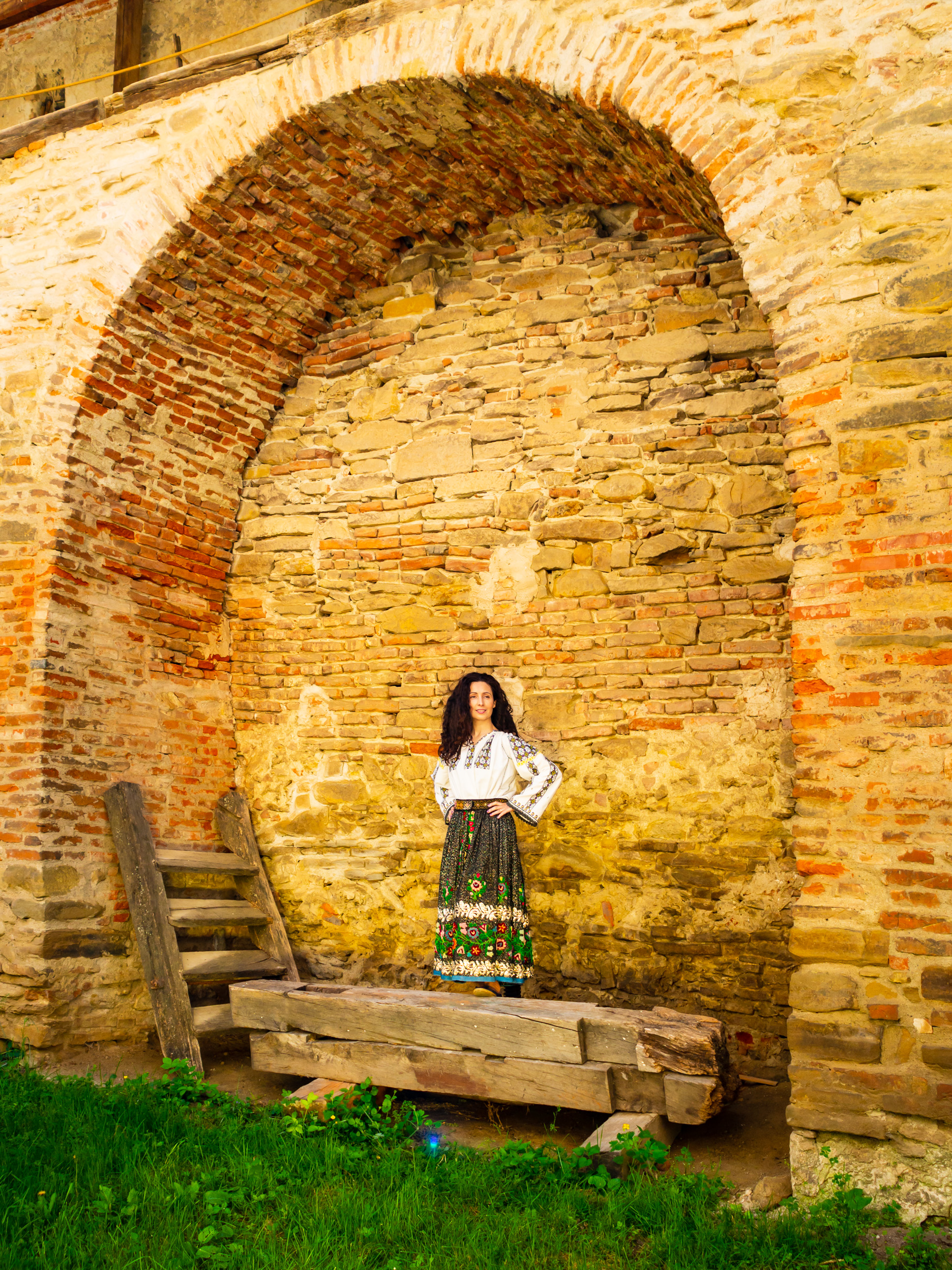 Wearing a traditional, handmade, vintage Romanian costume from her collection
