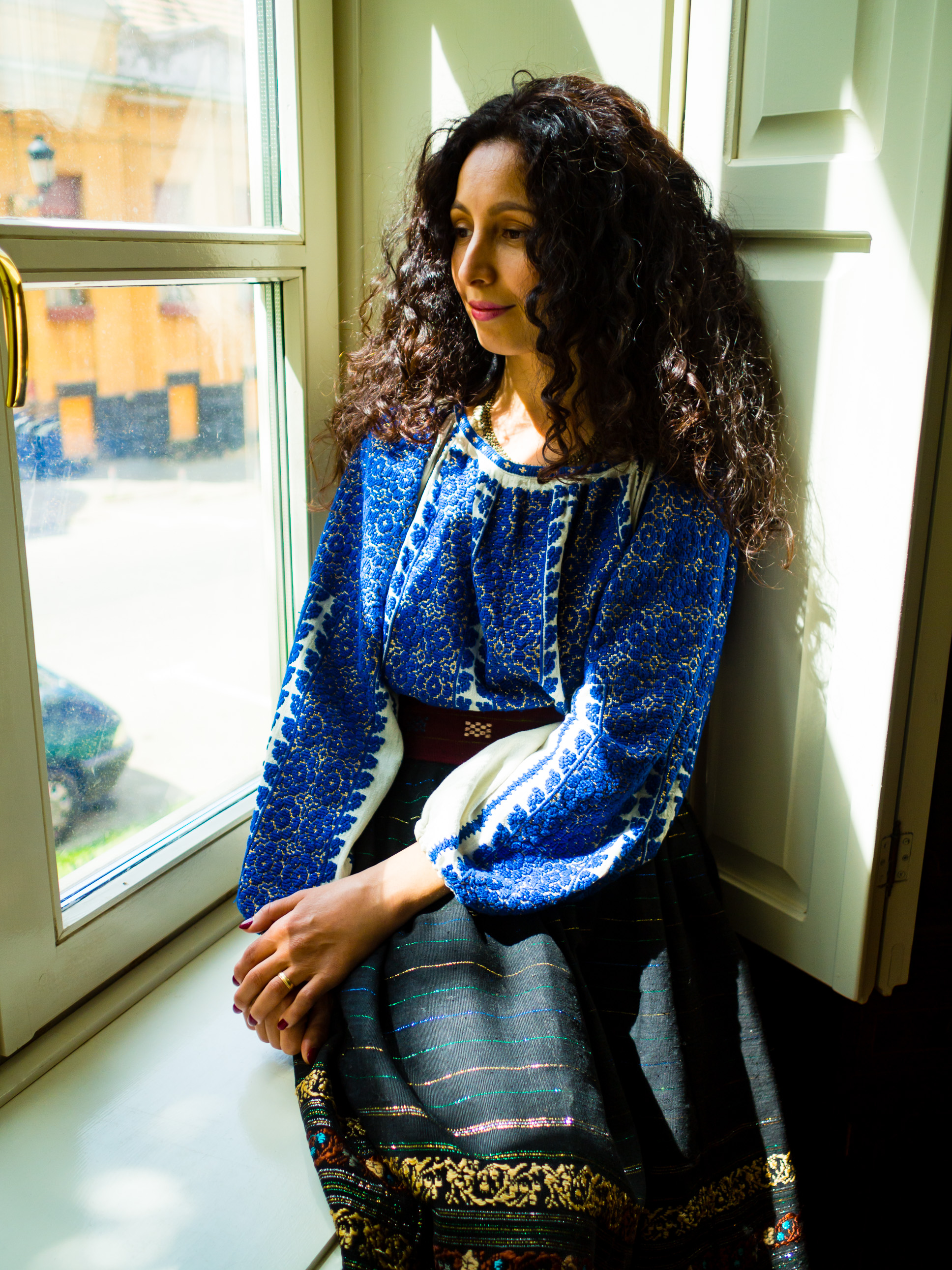 Dressed in a traditional, vintage, handmade Romanian costume, composed of a handwoven ie and a loomwoven skirt and belt. Part of her private collection of historical Romanian clothes. More details at Straie Alese (http://straiealese.com)