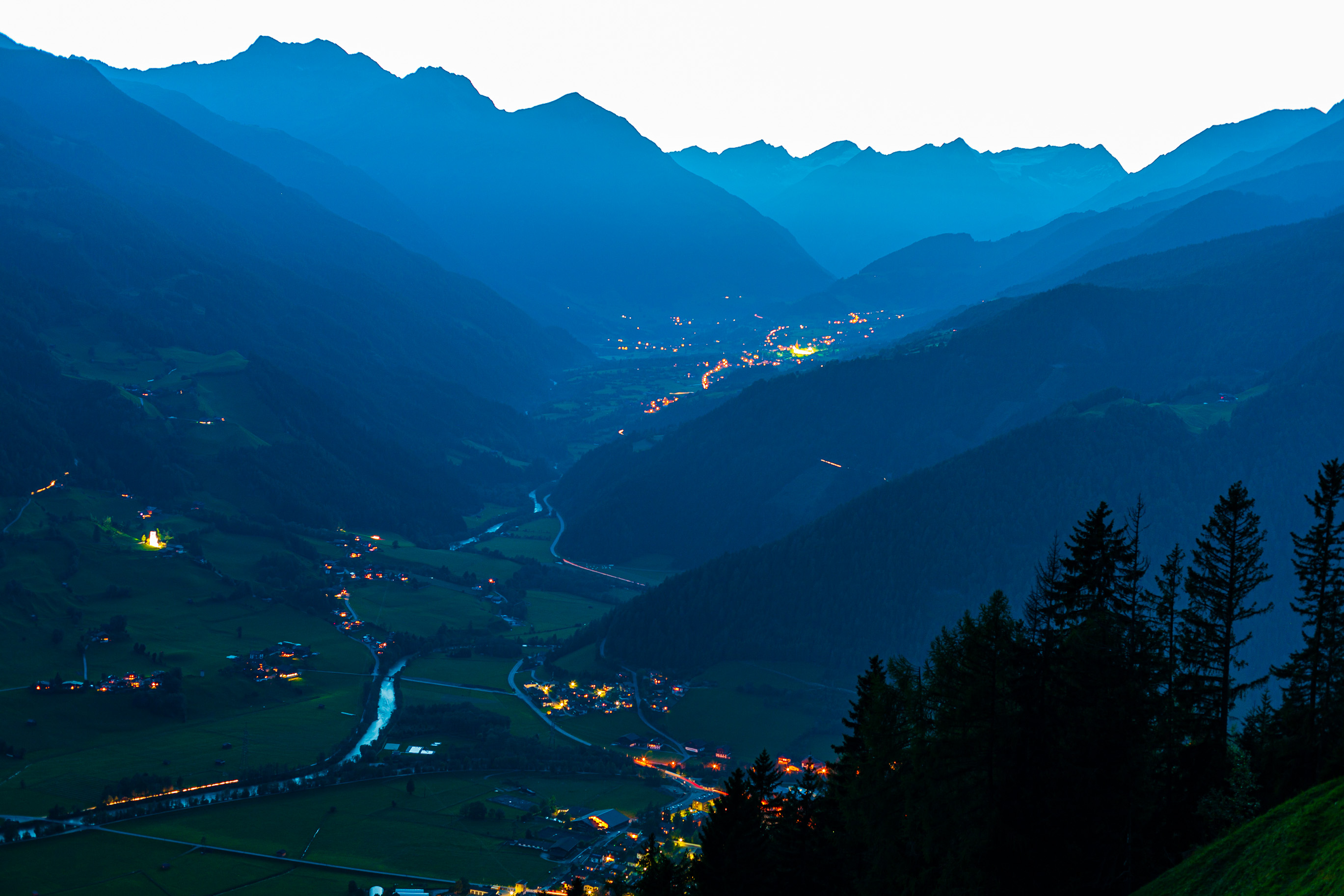 A view of Matrei from Goldried Mountain, specifically from the Goldriedbergbahnen, a winding road that lets one ascend and descend the mountain. Part of it is paved, and most of it is unpaved.