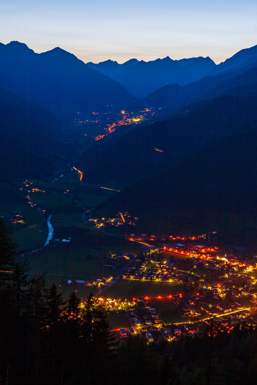 A view of Matrei from Goldried Mountain, specifically from the Goldriedbergbahnen, a winding road that lets one ascend and descend the mountain. Part of it is paved, and most of it is unpaved.
