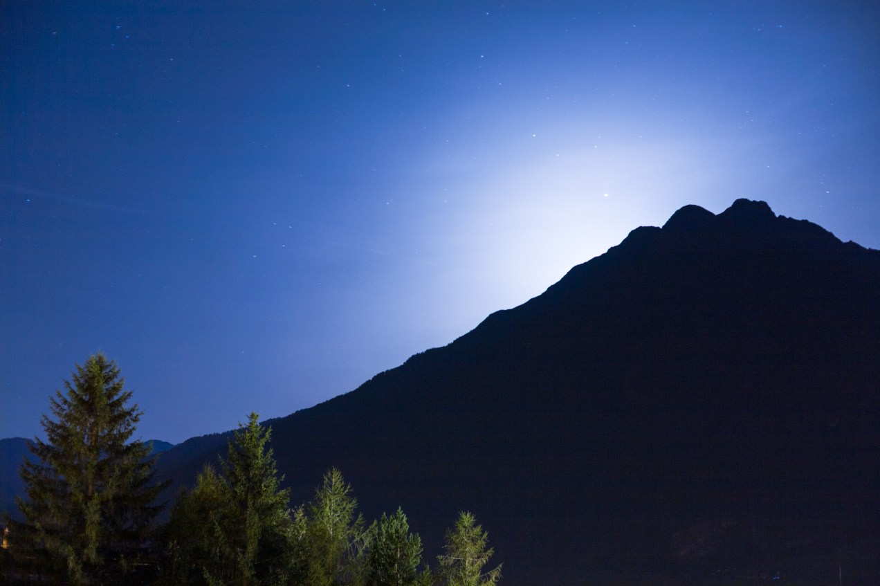 I could see the sky was very clear that evening as the moon rose, but with the moon filling the sky, it wasn’t possible to get a nicely exposed photo. I waited until it dipped below the mountain top, and that’s when I took this photo. I thought it made for a much better view. This was taken in the village of Matrei, in Osttirol, Austria.