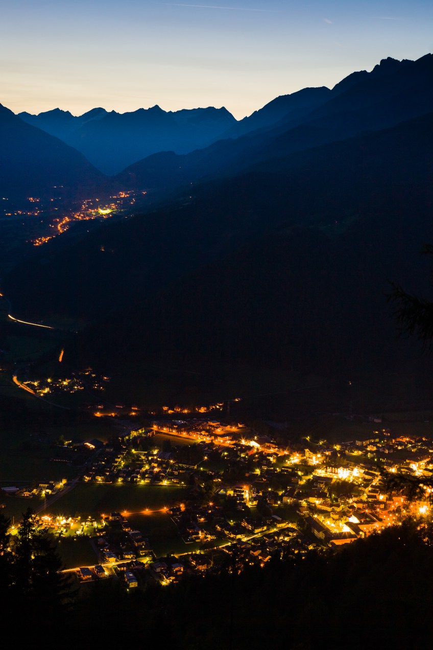A view of Matrei from Goldried Mountain, specifically from the Goldriedbergbahnen, a winding road that lets one ascend and descend the mountain. Part of it is paved, and most of it is unpaved.