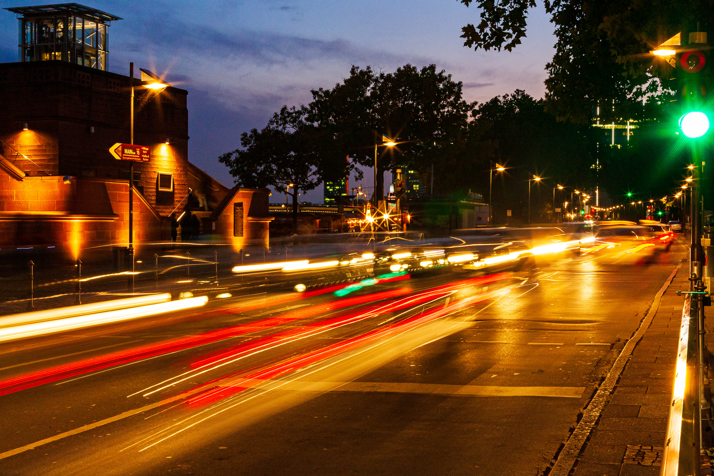 Late evening traffic at a busy intersection in Frankfurt, right outside the old city plaza, across the street from the Main river.