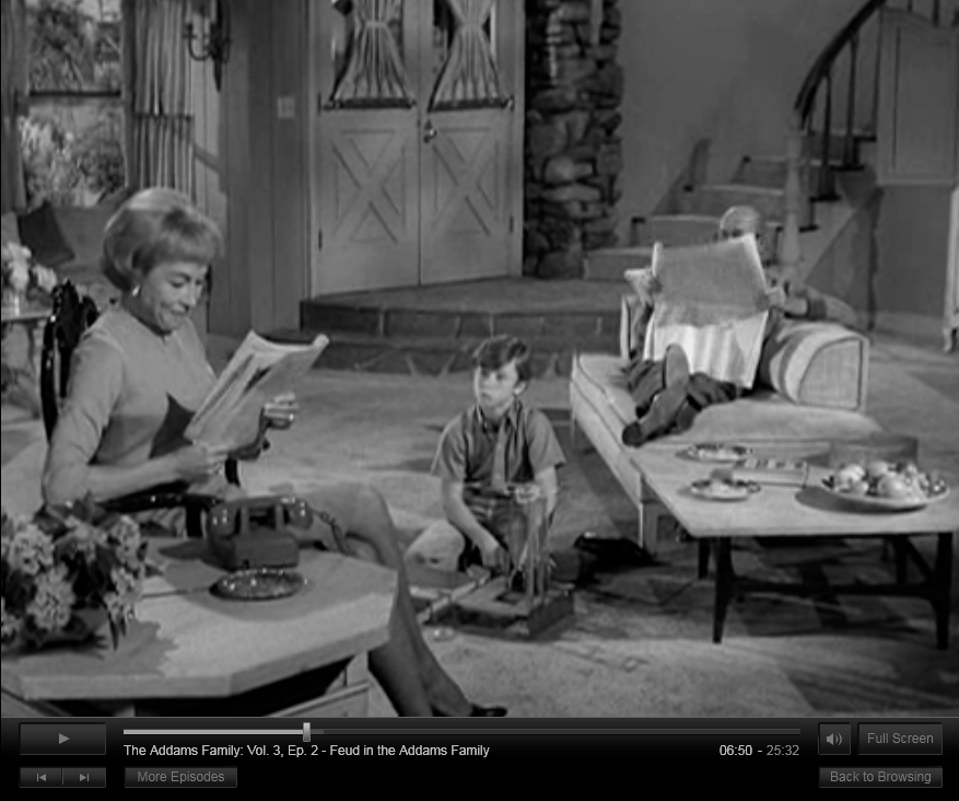 I noticed something funny this morning, as I was watching “Feud in the Addams Family”, the second episode of the show’s third and final season (according to Netflix), or the eleventh episode of the show’s second season (according to IMDB). The set in one of the scenes looked awfully familiar — too familiar for my memory. As it turns out, the set was the living room from Mister Ed, another of my favorite classic TV shows, which at the time was in its fifth (or sixth) season, depending on which source you consult.