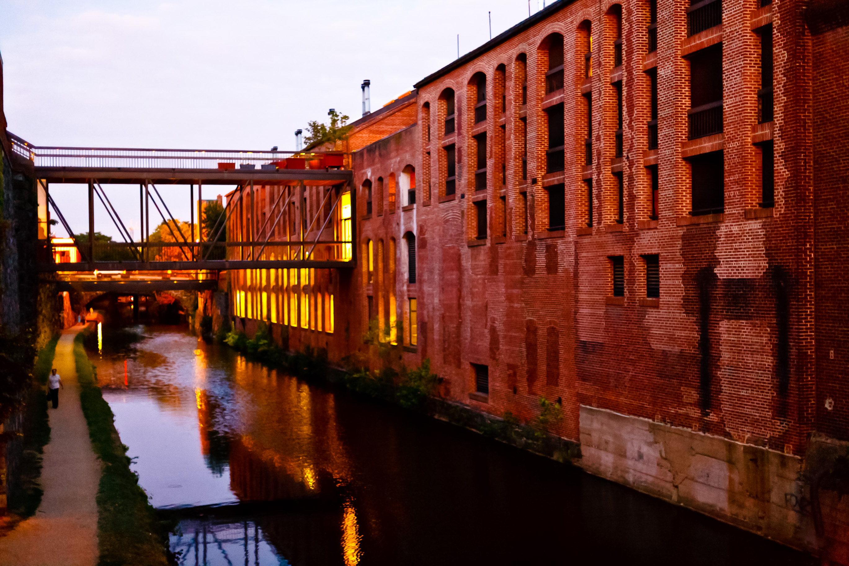 The C&O Canal at night, Georgetown, near the waterfront, DC, USA.