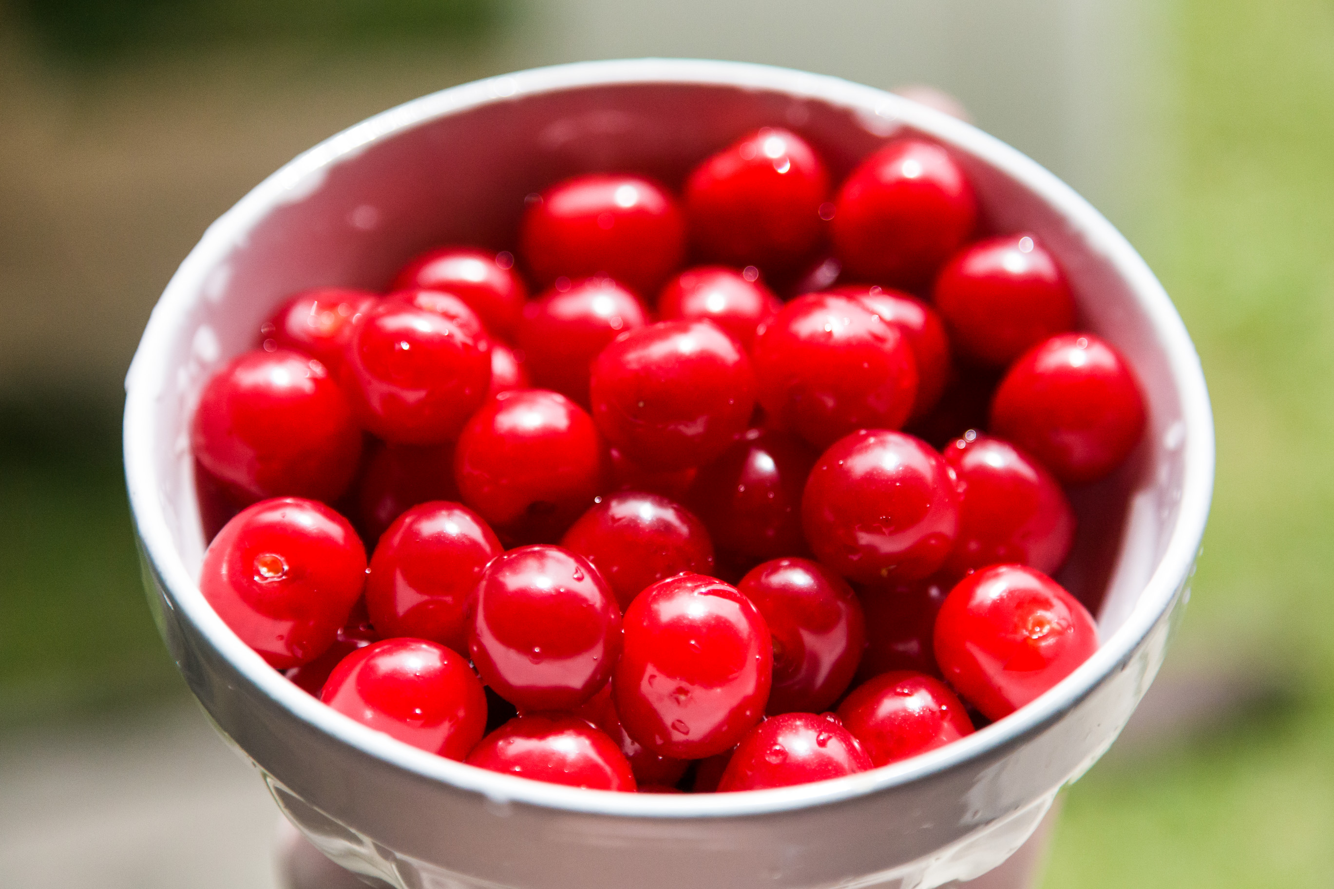 Ripe sour cherries, served in a round white porcelain bowl, Medias, Romania.