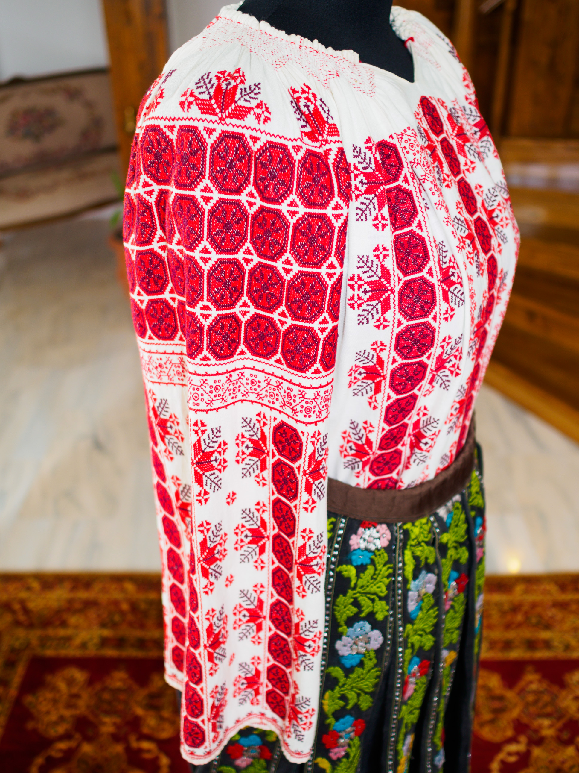 A traditional, hand-sewn Romanian costume featuring ancient colors and motifs