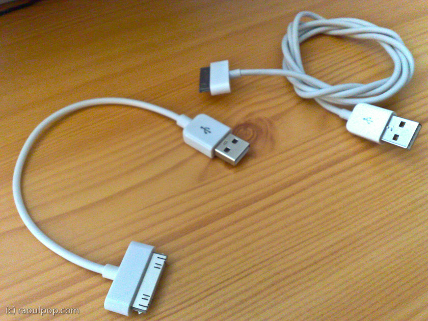 The cable I have can be seen the right side of the picture shown above, or in the two photos shown below. The longer cable, the one used to connect the iPhone to the laptop, is the 20cm one, and the shorter cable, the one used to connect the iPod to the laptop, is the 7cm one.