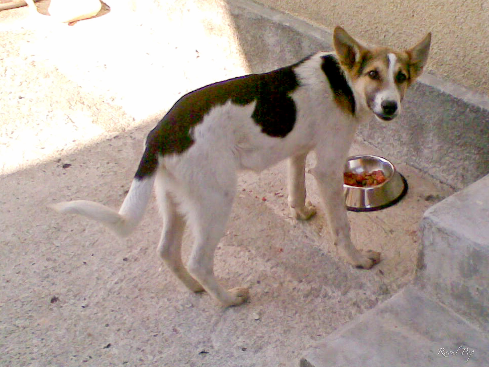 Throughout that day and the next, he ate enormous amounts of food and he began to look better. At night, he slept on our doorstep. Although he could leave whenever he wanted, he stayed. (We don’t like to tie up our dogs.) The third evening, he disappeared, and he showed up the next morning a little bloody. Then, later that day, he disappeared again for a few hours. That’s when we decided to make inquiries. It was clear to us that he belonged to somebody and he still had ties to that place, in spite of the abuse and lack of food.