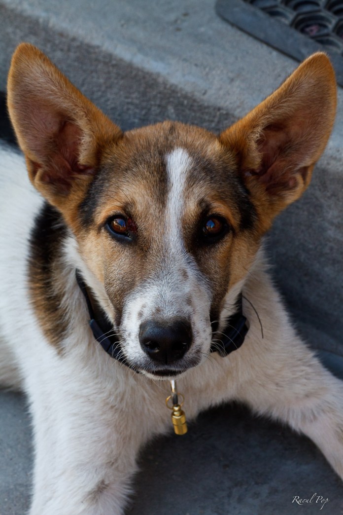 This bright-eyed pup showed up on my grandmother’s doorstep in Maramures this past Sunday morning. Although happy to get my attention, he was clearly suffering: he looked as if he hadn’t had a decent meal in weeks, as his ribs were showing through the fur, and he was full of fleas. He had the outline of a collar around his neck, so from the looks of things, he’d escaped from a situation where he was abused. (The photos you see here were taken a couple of days after he’d been in our care, so they don’t show his initial state. The collar you see in these photos is a new one we bought him.)