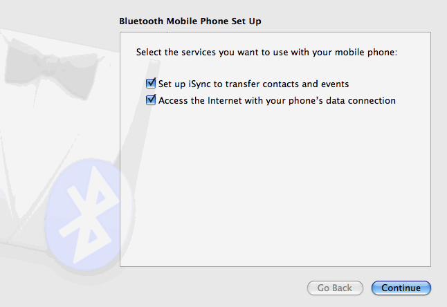 That first evening after I configured things as outlined above, I was able to connect and disconnect at will. However, the second morning, I got a “Could not authenticate” error. I clicked on the “Set Up Bluetooth Device” (shown above), and re-configured my N95 (as detailed in Step 3). After that, it was okay for the rest of the day, but the same connection issue re-surfaced the next day. I’d read that keeping iSync open while you connect will help, and I tried it, but it didn’t seem to work reliably for me. What has seemed to work is logging in and out of my account on the Mac, and rebooting the phone.