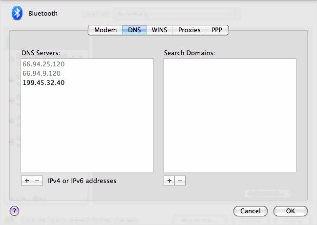Now click on DNS. Some say you should pre-fill DNS server addresses, because your mobile service provider may or may not give them to you. Thankfully, T-Mobile will automatically assign you two DNS server addresses when you connect, but just to be on the safe side, grab one or two more DNS addresses from a public DNS server list like this one and add them to the DNS preference pane. If you look below, the two DNS addresses that are grayed out were automatically assigned by T-Mobile after I connected through the phone, and the single address in black was the one I manually added.