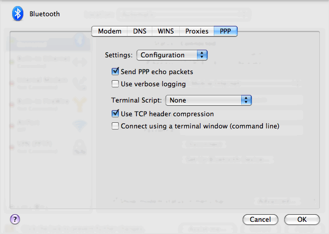 • Disable “Send PPP echo packets” and “Use TCP header compression” in the PPP Configuration preference pane