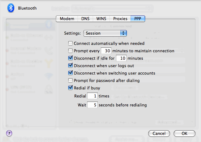 Don’t worry about WINS or Proxies, go to PPP, where you’ll have a drop-down menu. The Session options on the PPP preference pane should look like this: