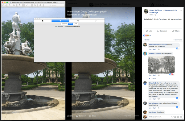 When I looked at a photograph uploaded by someone to a FB group, again I found no metadata. So even though the photographer identifies herself in the caption of the photo, that caption isn’t in the metadata, and should the photo be downloaded and re-uploaded, it’s easy to see, in spite of good intentions, how easy it would be to lose track of the photographer’s information.