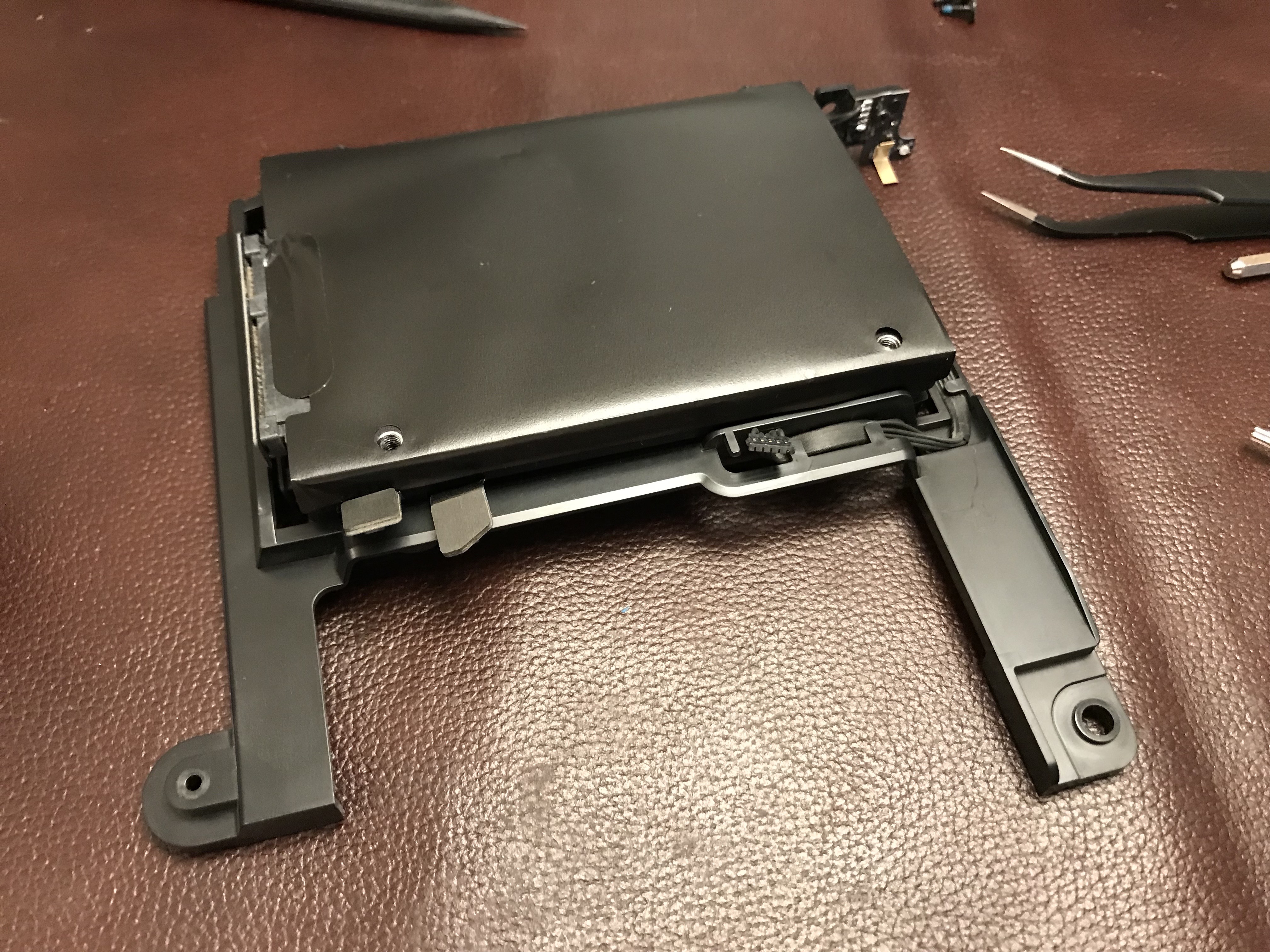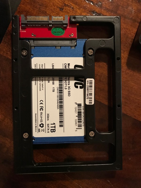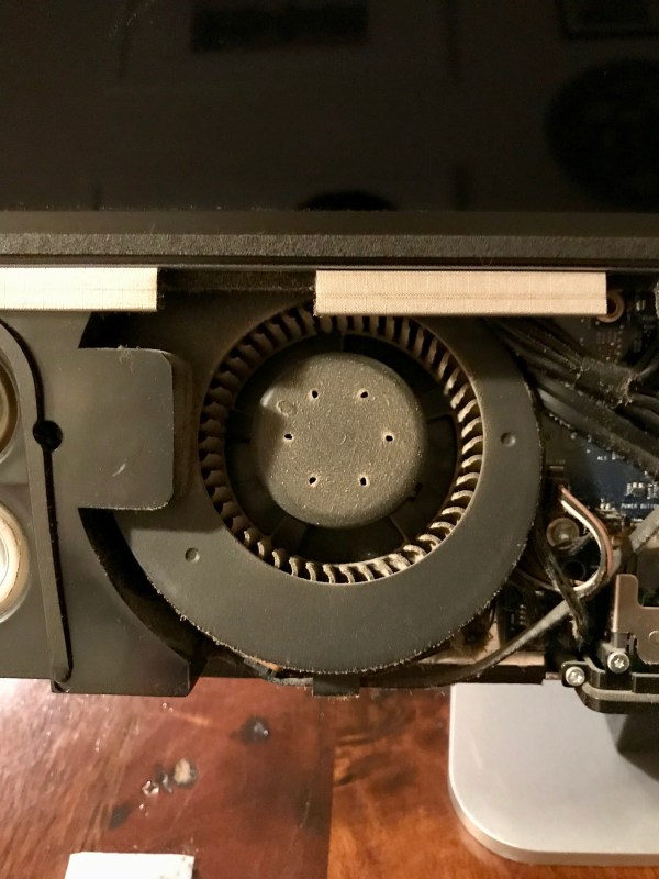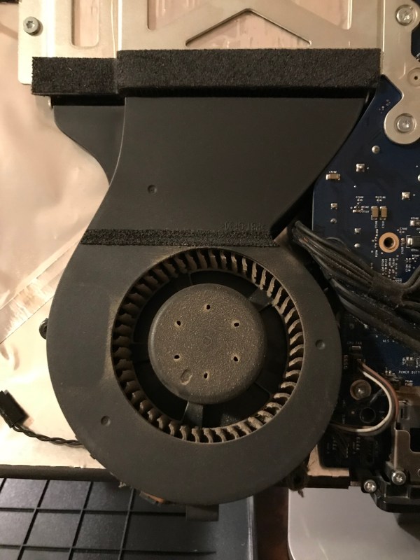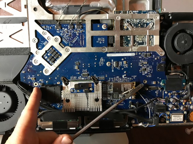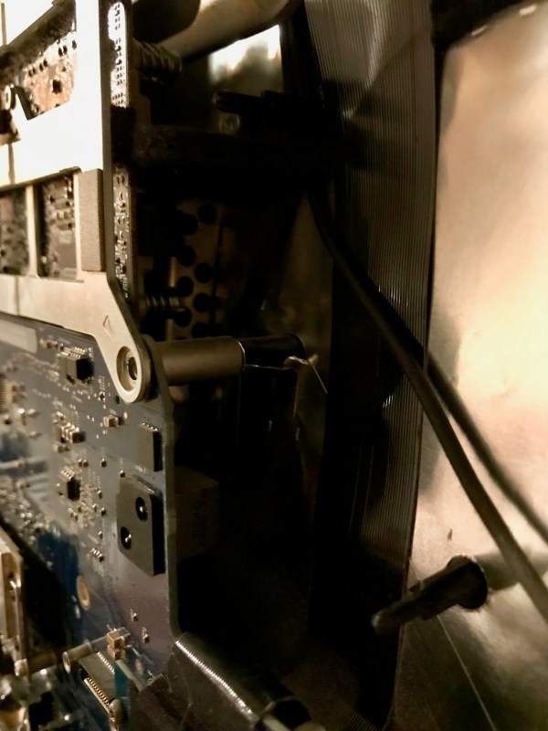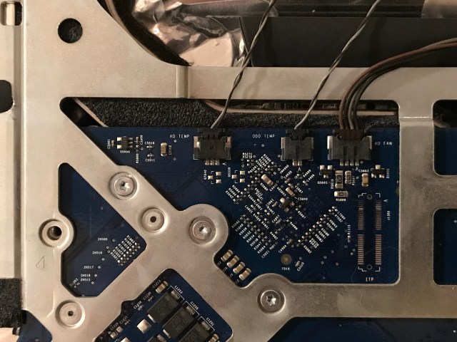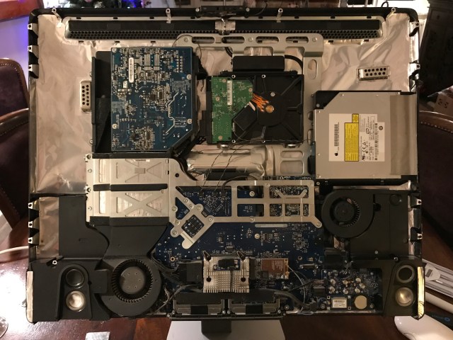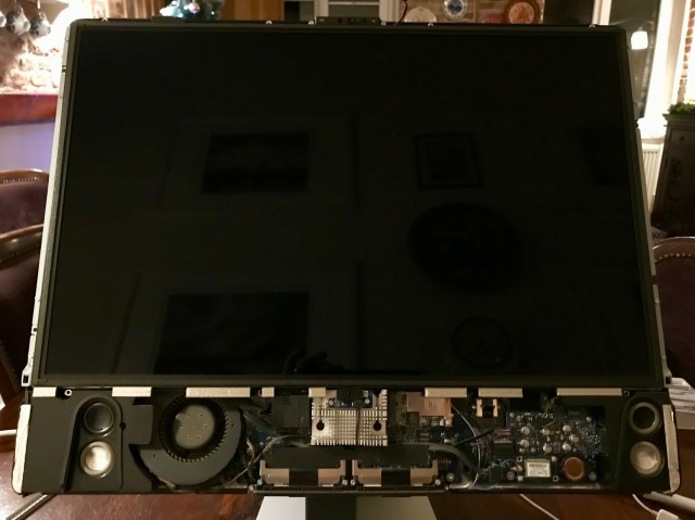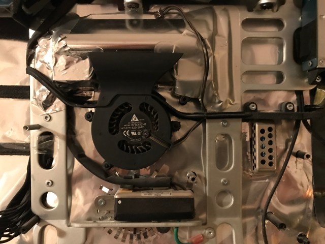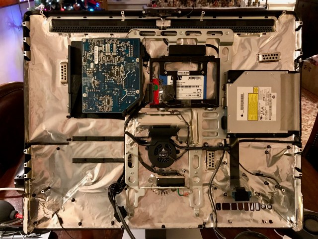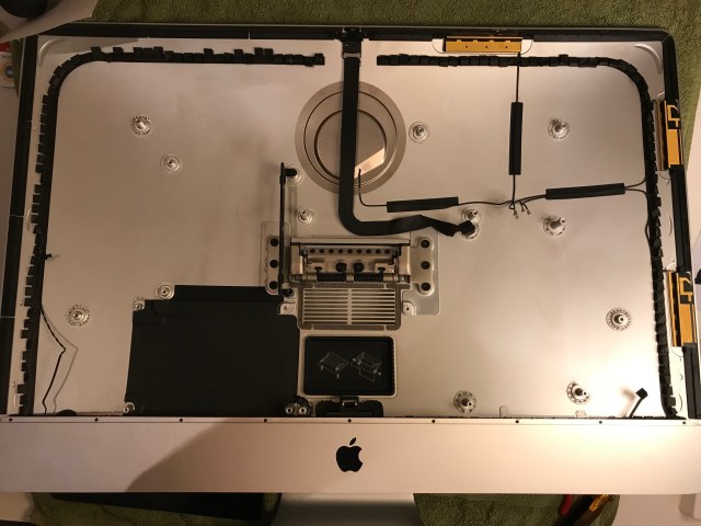 Back in January, I set to work on the upgrade. Those of you who’ve opened up iMacs released from 2012 onward know how much “fun” it is to pry open the adhesive strips that hold the display affixed to the aluminum body. I’ve bypassed all that crap, given how many times I’ve had to open up my iMac, and I use four strips of black electrical tape to hold the display to the case at each of its four corners. It works. It’s not pretty, but it’s not ugly, particularly if you cut the four strips equally and neatly, and you affix them at fairly exact points. You can’t even see them from the front of the computer. The display is black, the tape is black, it blends right in. You only spot them from the back. Anyway, it’s a lot easier for me to open up my iMac than it is for those who stubbornly cling to using the adhesive strips every time (there’s a joke in there somewhere).